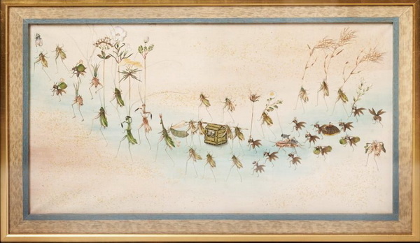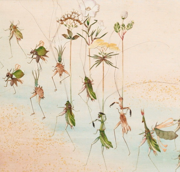 Фон выделен золотой пудрой, а детали травы прорисованы легкими мазками кисти. В японском искусстве существует давняя традиция, восходящая к XII веку, согласно которой животные изображались в юмористическом ключе за обычными человеческими занятиями. Трехмерная сцена, проработанная с использованием тончайших деталей, изображает очень распространенный сюжет, иллюстрирующий процессию феодального лорда, совершающего путешествие из своих владений в столицу Эдо в сопровождении самураев и высокопоставленных лиц. Только вместо людей мы здесь видим кузнечиков, сверчков, муравьев и ос, несущих цветы.