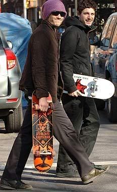 Хит Леджер, сыгравший сдержанного ковбоя в "Горбатой горе" и серфера в австралийском мыле "Home and Away", кажется, продолжет свои энергичные роли и вне экрана. 27-летний актер, небрежно одетый в фиолетовую круглую шапочку и мешковатые брюки, был замечен, во время катания на роликовой доске около своего дома в Бруклине, где он живет с актрисой Мишель Вилльямс и их годовалой дочерью Матильдой.