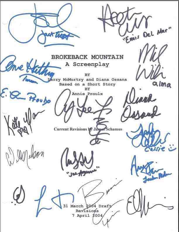 Оригинальный сценарий "Горбатой горы" с автографами актеров и съемочной группы, с пометками и исправлениями режиссера и продьюсеров.