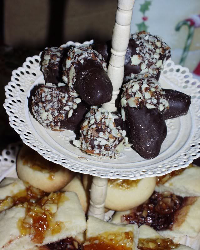 Топим горький шоколад. Берем финики. Используя зубочистки, обмакиваем финики в растопленный шоколад, затем - половинку финика искусно обмакиваем в мелко толченый миндаль. Втыкаем зубочистку в какую-нибудь половинку картошки или яблока, чтобы конфета подсохла на весу и продолжаем, пока не наделаем столько конфет, сколько душа желает.