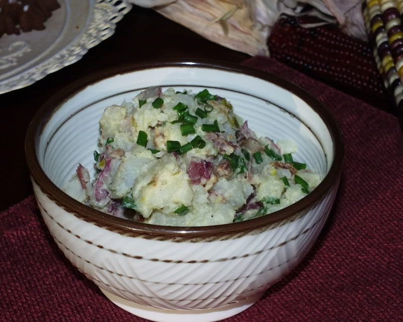 Бекон измельчить, всыпать в картофель, тщательно перемешать, всыпать мелко нарезанный зеленый лук. Заправить, еще раз тщательно перемешать.