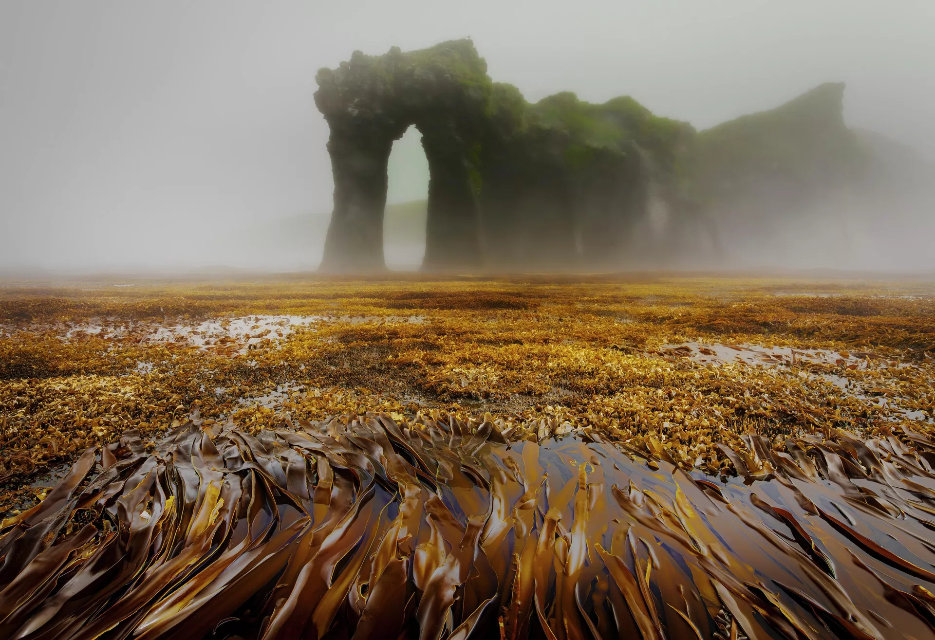 Лучшей признана работа Александра Лаврентьева "Таинственные арки острова Симушир". Этот архипелаг вулканического происхождения — часть Большой гряды Курильских островов. Труднодоступный, но места красивейшие. "Одно из них — арочный останец-кекур на берегу Охотского моря, окруженный полями фукусов и ламинарий. Особенно красивыми и таинственными выглядят арки при отливе в тумане", — рассказывает автор.