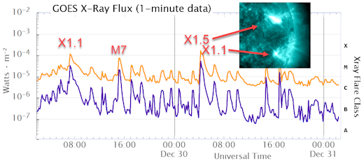 ОБНОВЛЕНИЕ № 2: Продолжающийся шторм усилился. Порог сильной (G4) геомагнитной бури был достигнут в 17:41 UTC (1 января). Видимое полярное сияние, вероятно, сейчас наблюдается в средних широтах, где сейчас темно. Следует также отметить, что 6-метровый (50 МГц) любительский радиодиапазон теперь открыт для станций в более высоких широтах, чтобы они могли связываться друг с другом через полярное сияние.