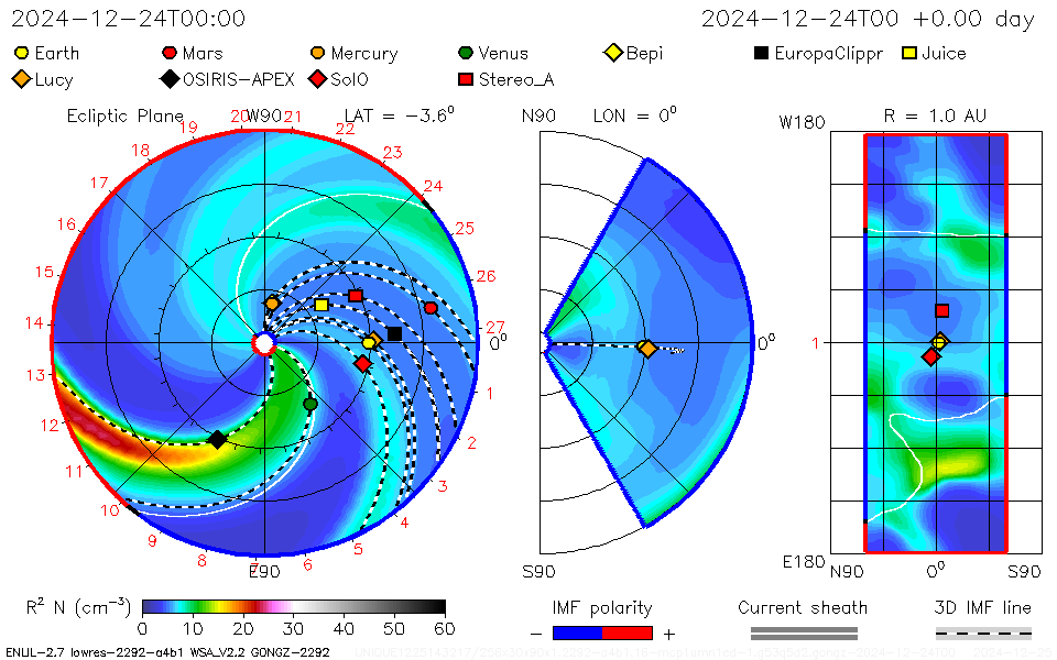 Ниже представлен вид видимого солнечного диска в Рождество. Сторона Солнца, обращённая к Земле, в настоящее время испещрена солнечными пятнами, и из-за этого индекс солнечного потока вырос до 259. Самой крупной солнечной вспышкой за последние 24 часа стала импульсивная вспышка M4.9 в 04:49 UTC (25 декабря). Был образован очень слабый и узкий корональный выброс массы, но он не должен оказать существенного влияния на нашу планету. Дополнительные M-вспышки будут возможны в течение следующих 24 часов.