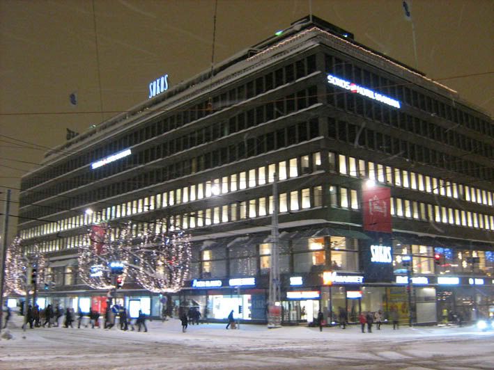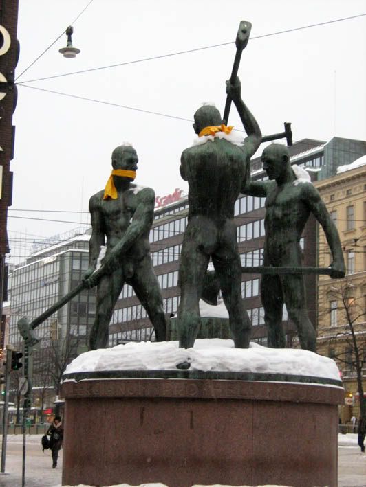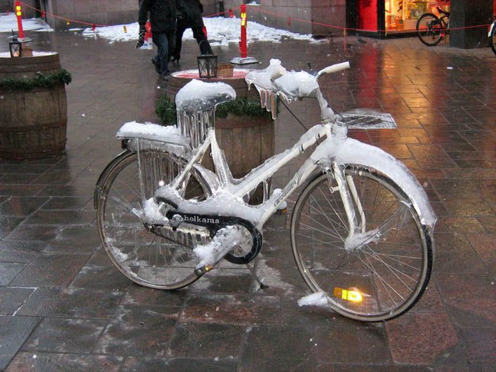 Поскольку до заселения в гостиницу была еще уйма времени, отправились мы в Стокмэн. Кстати, не все финские голые мужики в виде памятников зимой мерзнут. Вот об этих кующих чуваках кто-то позаботился, шарфегами их снабдил :) Правда почему-то только двоих, третьему не перепало, или он самый закаленный! Зато вот финским велосипедам зимой приходится несладко :) В Хельсинки тоже уже вовсю ощущалось предпраздничное натсроение! В Стокмэне, к примеру, кругом были расставлены и даже развешаны йолочки. Да и в любом магазине и просто на улицах, все было очень красиво и по новогоднему!