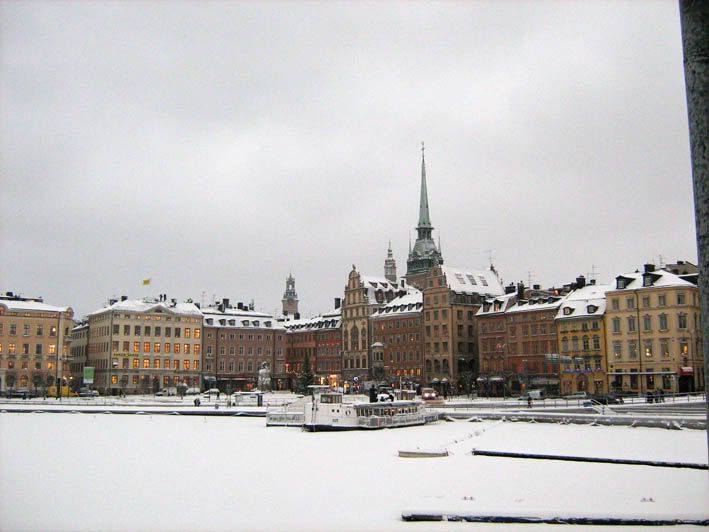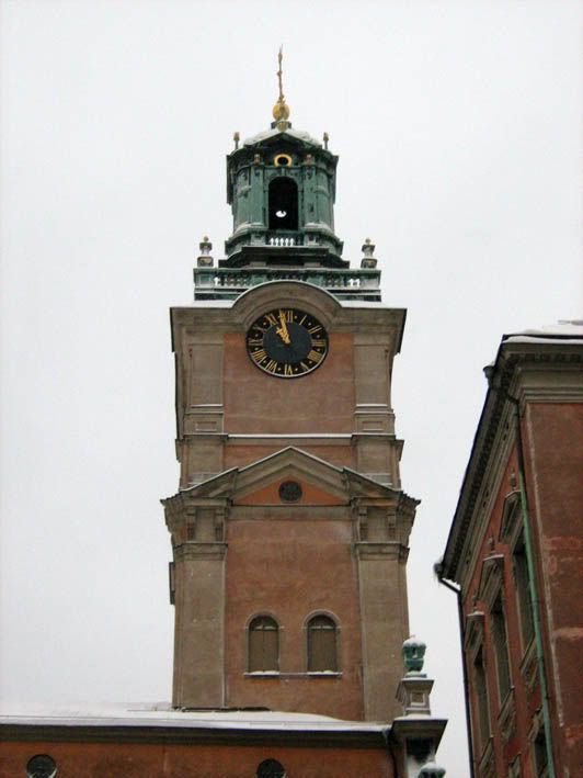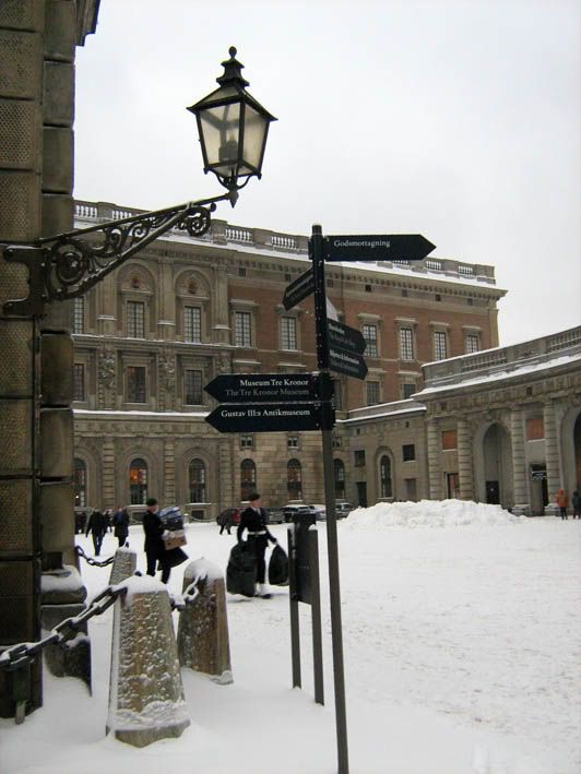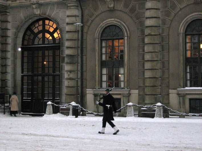 Поскольку времени у нас было крайне мало, весь город мы, понятное дело охватить не смогли. И потому решили погуляться с чувством с толком только по Гамла Стану, что в переводе означает Старый город. Для начала отправились к Королевскому дворцу. Короля Швеции, убирающего снег возле крыльца, правда, не встретили, но зато попали на... даже не знаю, как это называется... Ну короче, когда на городской башне часы отбили одиннадцать (офигенный звук был, кстати, весьма в тему мрачной готичности), караульный с ружъем, что стоял, как вкопаный у входа во дворец, вдруг ожил и прошелся с дозором на десять метров влево. Кроме нас троих в этом направлении никого живого не было, и караульный, видимо убедившись, что мы не представляем никакой угрозы безопасности Королевства, вернулся обратно на свой пост. Но его белые валенки вынесли мне мозг :)
