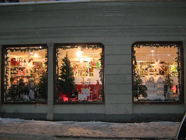 Вообще, Стокгольм зимой окутан какой-то готической мрачностью... Очень низкое, нависающее прямо над тобой небо, остроконечные башни зданий и сугробы снега под ногами. Всю эту офигенную и очень любимую мною мрачность немного разбавляли уже весьма заметные приготовления к Рождеству. Все витрины выглядели, как рождественские открытки! А вот эта эмо-йолочка надолго задержала нас у этой витрины. Креатив, однако!