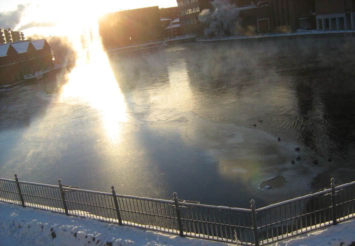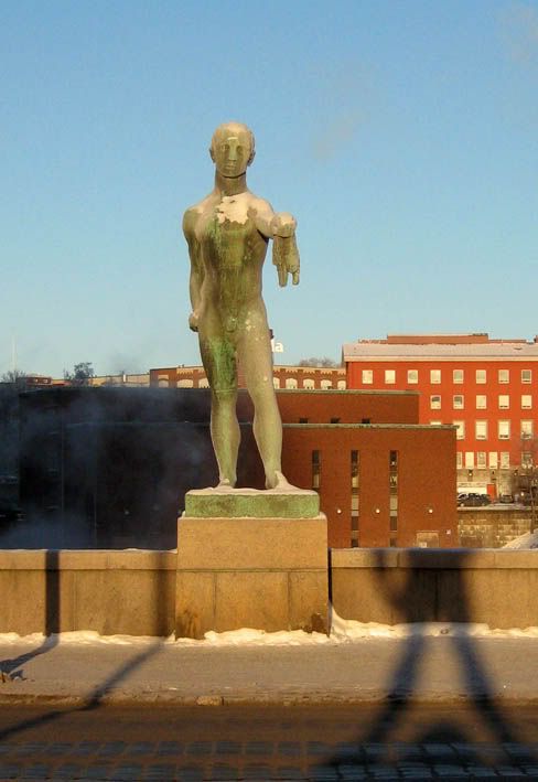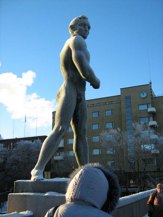Из достопримечательностей, доступных зимой, там пожалуй только река Таммеркоски, которая летом выглядит так, а зимой вот так. Интересно, вода там горячая чтоли? Почему-то пар от нее валил столбом. Еще есть суперпамятники на берегу. Вот я обожаю финнов! Ну подумаешь, поставить памятник какому-нибудь полководцу на коне, это же так банально, фи! Зато вот такого памятника какому-то голому мужику, протягивающему кусок тины своему не менее обнаженному товарисчу на другом берегу моста - вот ТАКОГО точно в мире нигде больше нет :)