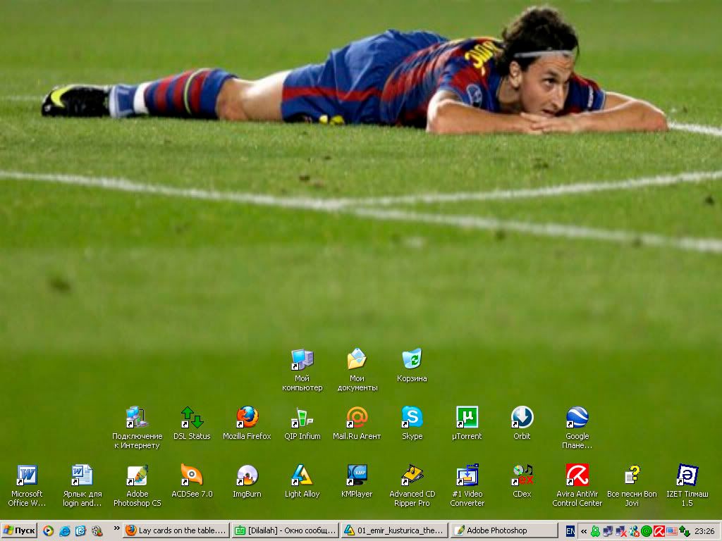 В качестве картинки у меня на рабочем столе стоит, а точнее, лежит, мое носатое чудовище:) Поскольку у меня не доходят руки сделать себе с ним (или с кем-нибудь еще) нормальную приличную обойку, я просто запостила вот эту фоту и все :) Лежит чудовище почти что на ярлыках. Их у меня ровно столько, сколько программ, которыми я наиболее часто пользуюсь. Лень мне лезть в меню, поэтому все на столе валяется. Страсть к симметрии и тут дала о себе знать, как видите:) Первый ряд - ну это понятно, второй - все проги, связанные с инетом, а третий - все остальные нужные программки. Ну, и открытыми в момент осаливания у меня были, собственно ЛиРу, на Мэйкиной страничке, Квип, в котором я болтаю с Сарой, Light Alloy, в котором играет эмир Кустурица со своей бандой, и фотошоп.