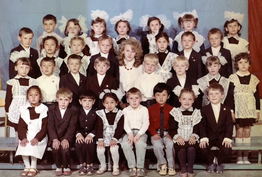После садика я, естессно, пошла в школу. Сие знаменательное событие случилось уже совсем в конце 80-х, а именно в 88-м году. Тогда в школу пойти было проще простого, никаких тебе экзаменов, собеседований и прочей фигни. Пошел, записался, учись. Мы с Наташкой страшно радовались, что попали в один класс. Носились, как дикие по двору и орали: "А нам повезло! А нам повезло!". А первого сентября с утра пораньше мы отправились на первую в своей жизни "линейку". Как же мы, должно быть, шикарно выглядели в новенькой коричневой форме, с белыми кружевными манжетами, таким же воротничком и белом же фартуке, дурацкими бантами и с охапкой цветов! Волнительный момент! После торжественной линейки нас препроводили на второй этаж младшего блока, запихнули в кабинет, ставший нашим на три последующих года и нарекли 1 "З" классом. (найдёте меня?:)) Причем наша "З" была далеко не последней литерой для обозначения всех первых классов - И, К, Л, М, Н... Э, Ю, Я... Дело в том, что вторую в нашем микрорайоне школу еще достраивали, а к нашей же относились еще и дети, жившие на "Тайване". Отсюда и такой дикий наплыв. Самое удивительное, что когда школу мы заканчивали, осталось всего два класса - А и Б.