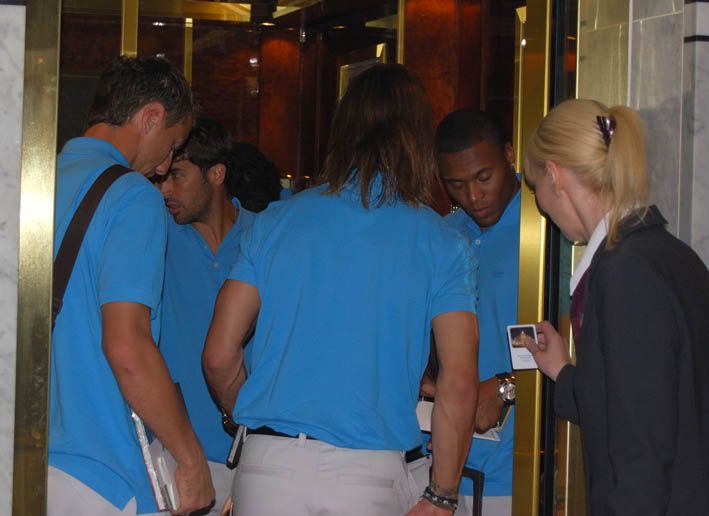 Хотя, благодаря Инне, для нас он начался еще второго вечером, ибо она была в гостинице во время приезда оболусов. А я ждала ее с огромным нетерпением, так как жутко хотелось посмотреть, что же она там нафотографировала. Наконец Инна приехала - довольная и полная впечатлений! Еще бы, увидеть своих родных любимых футболистов не по телевизору, а прямо возле себя! Фотографий было не слишком много, но зато очень хорошего качества. Фабио, правда, оказался жуткой редиской. Инна говорит, что он улыбался и смотрел прям в объектив, когда она хотела его сфотографировать, но когда сфотографировала, он скорчил такую моську! А вот Икер Касильяс вышел просто великолепно. Фотомодель, прям! А еще она сама сфотографировалась со своим любимчиком Серхио Рамосом! Еще были и другие футболисты, конечно, все получились отлично. Только вот Раулито так быстро убежал в лифт, что Инне так и не удалось его нормально сфотографировать.