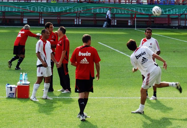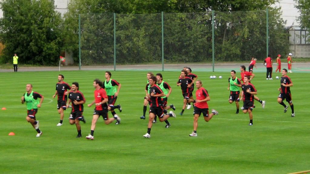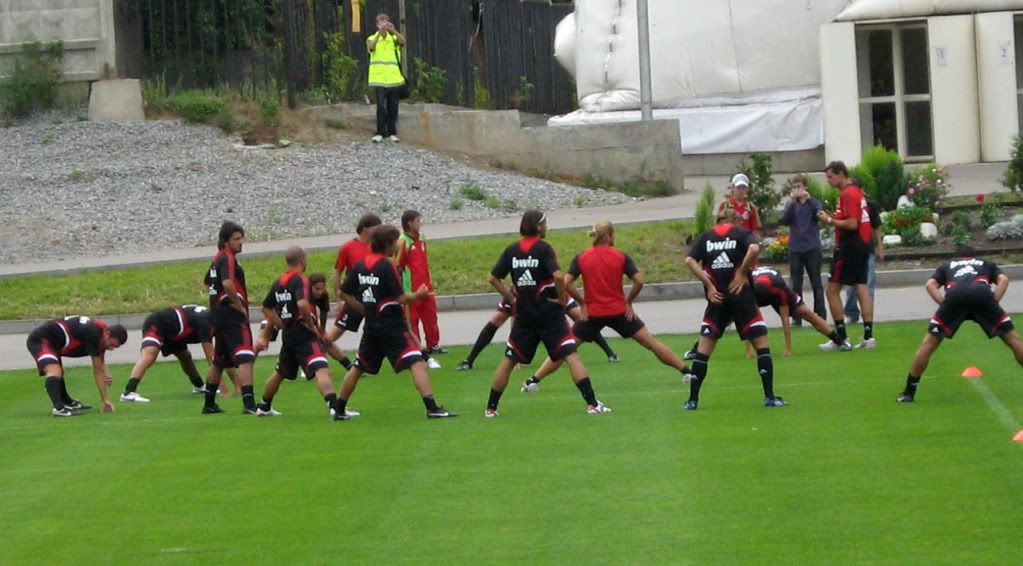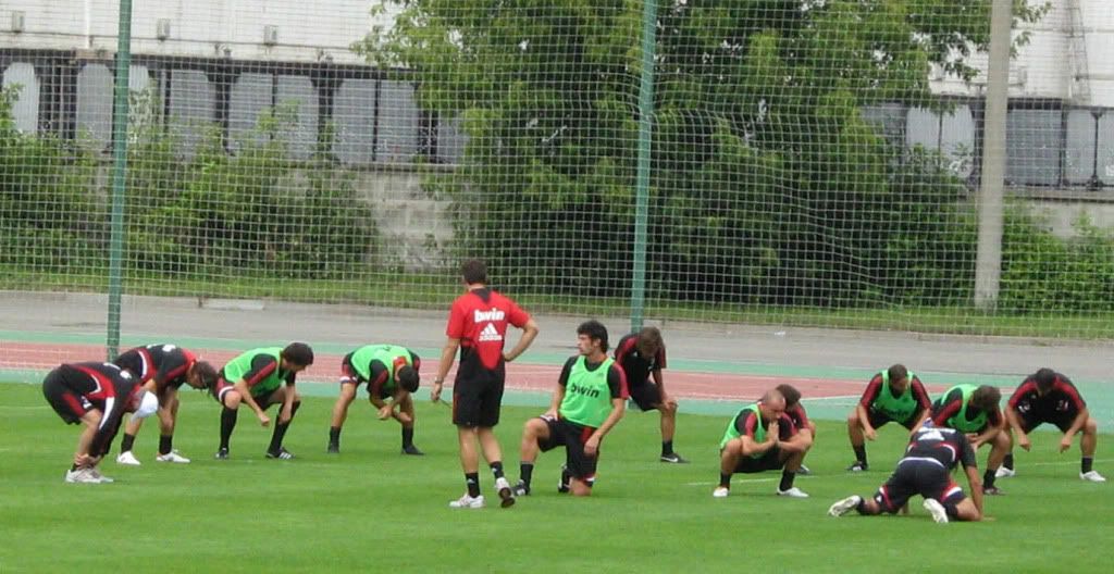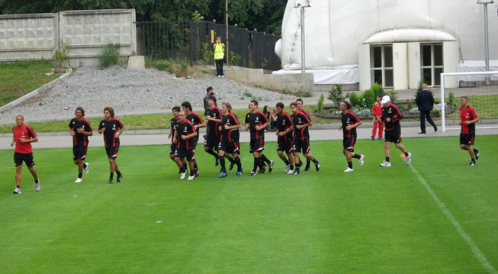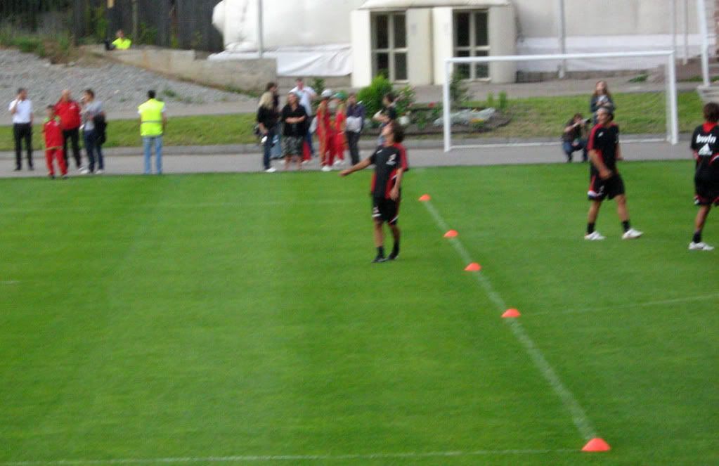 Тем временем миланцы вышли на поле, свеженькие, как огурчики. Мы просто поразились! В первых рядах бежал наш Капитан и улыбался. Все же он в потрясающей форме! По началу тренировка Милана выглядела весьма однообразно. Они бегали из одного угла поля в другой, периодически останавливаясь в этих самых углах и делая различные упражнения. Каха так усердствовал, что ему даже потребовалась помощь врача. К счастью, ничего серьезного.