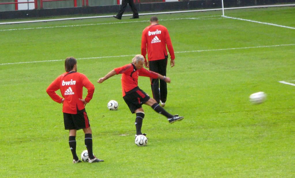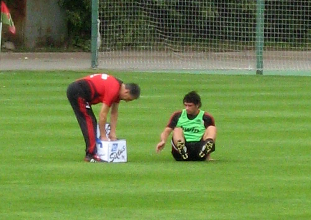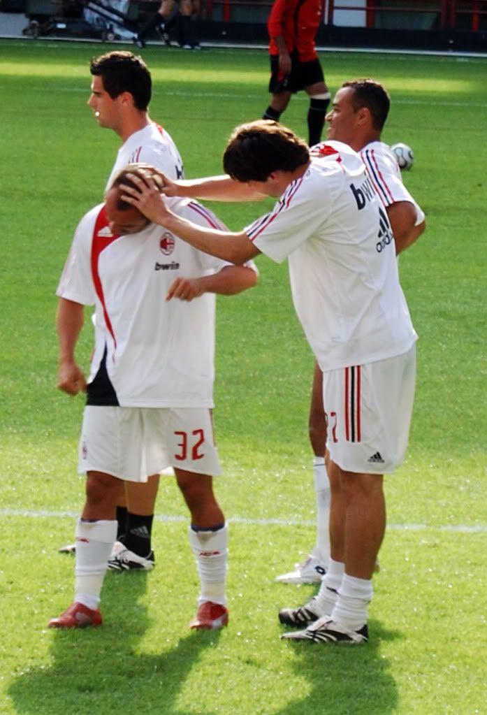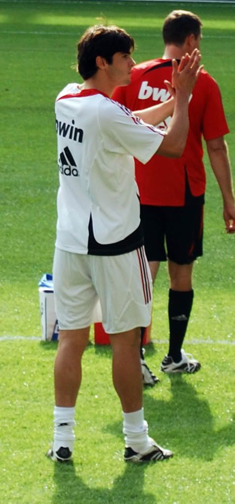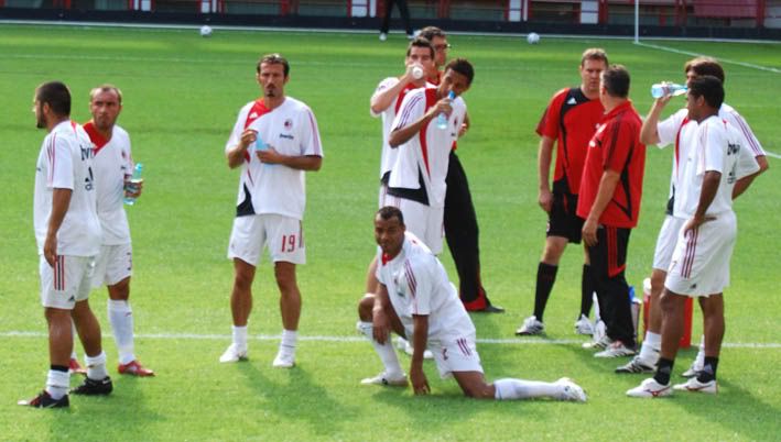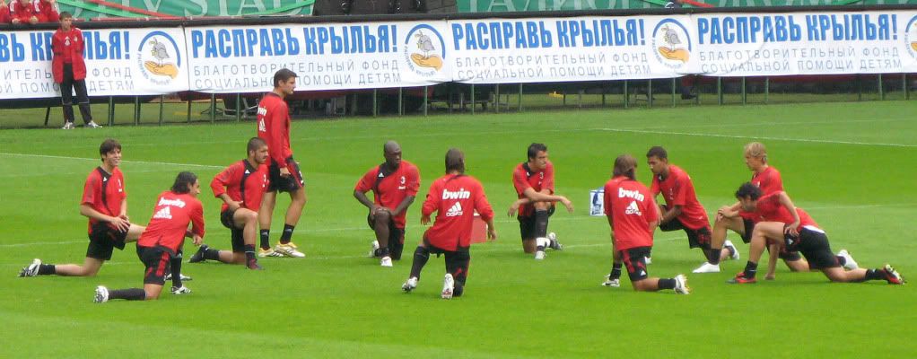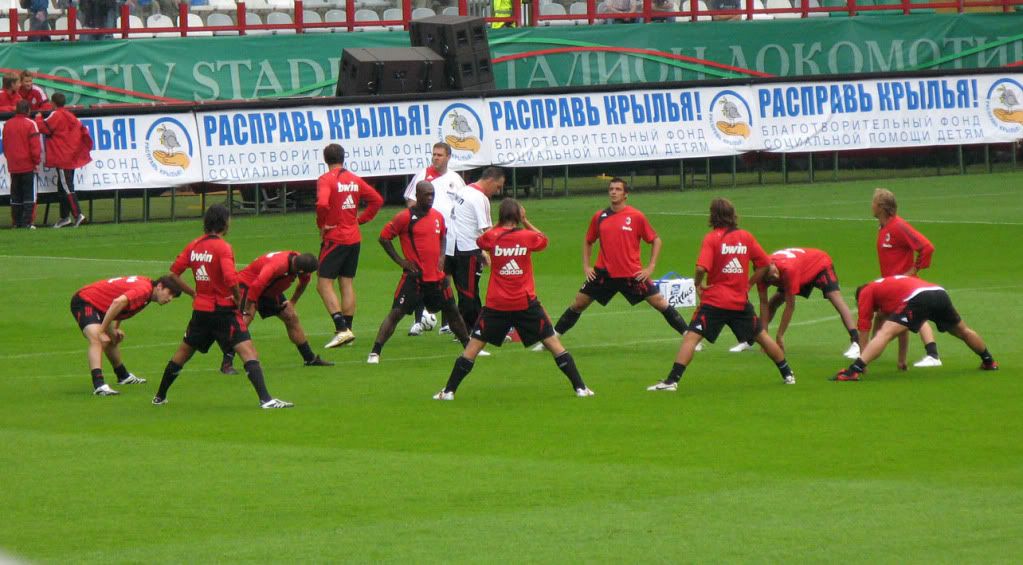 Тем временем миланцы вышли на поле, свеженькие, как огурчики. Мы просто поразились! В первых рядах бежал наш Капитан и улыбался. Все же он в потрясающей форме! По началу тренировка Милана выглядела весьма однообразно. Они бегали из одного угла поля в другой, периодически останавливаясь в этих самых углах и делая различные упражнения. Каха так усердствовал, что ему даже потребовалась помощь врача. К счастью, ничего серьезного.