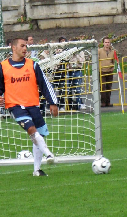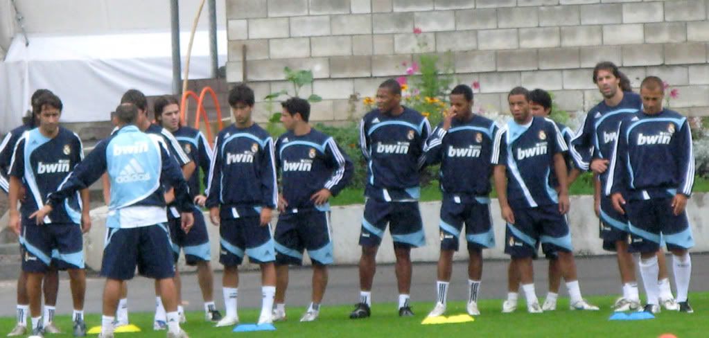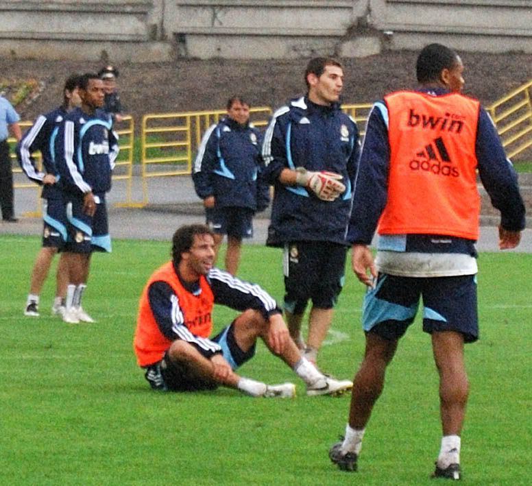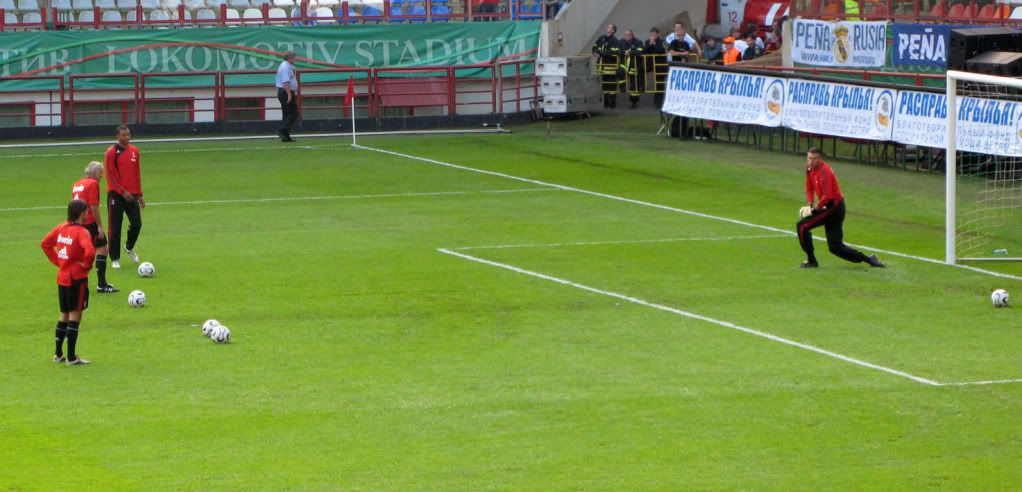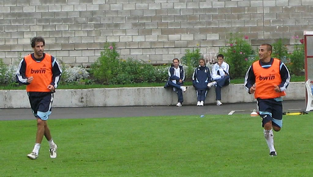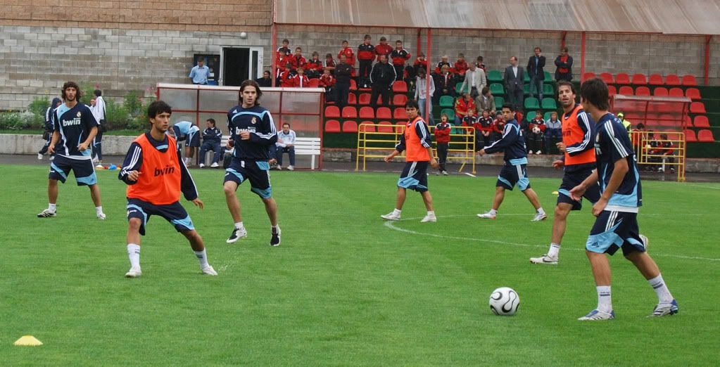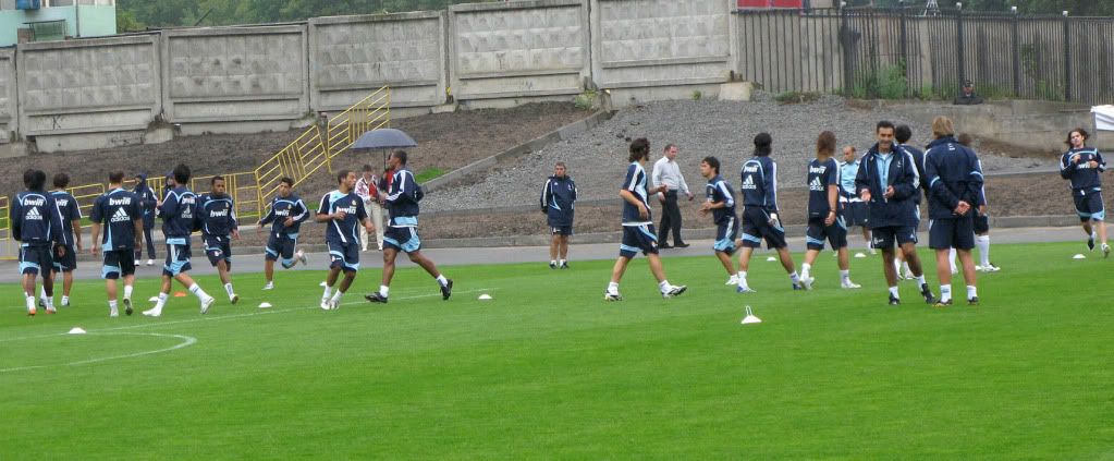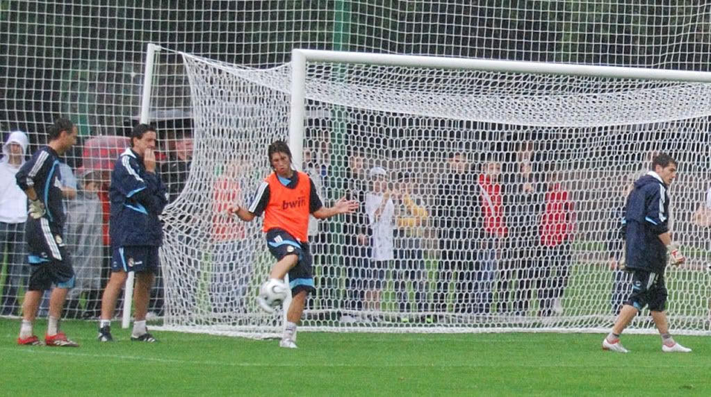 Тренировка проходила на каком-то запасном поле стадиона Локомотив. Его огородили заборчиком, и за ним толклись толпы народу! Черт, хотелось бы, чтоб людей было поменьше. Ну да ладно, мы, в конце концов, очень даже неплохо устроились, прям возле заборчика. Реаловцы выглядели так, словно полночи пили горькую и развлекались. В общем-то, так оно и было : ) Больше всех погулял, судя по виду, Каннаваро. Он полтренировки подпирал ворота и практически спал: ) Но иногда даже бегал, чем вызывал удивление даже у партнеров по команде :) И даже пару раз ударил по мячу. Но все же большую часть тренировки он провел, подпирая ворота Икера, болтая с одноклубниками и заглядываясь на девушек: ) Остальные вроде бы тренировались чуть поактивнее. Смотреть было интересно, во всяком случае.