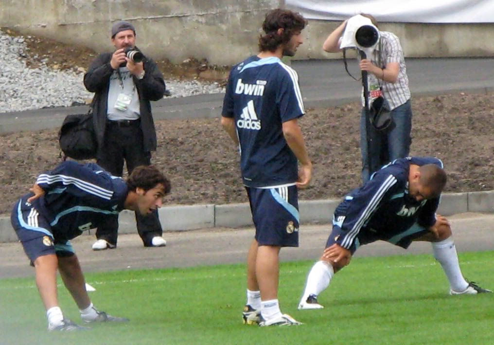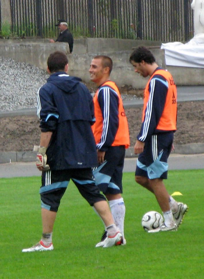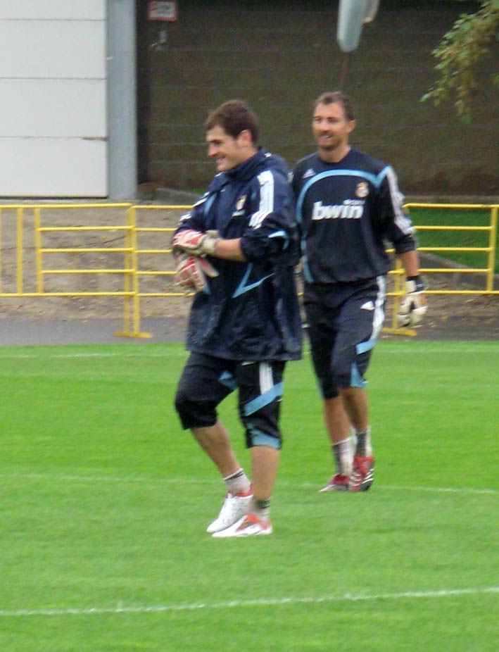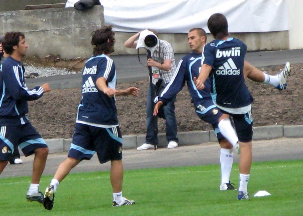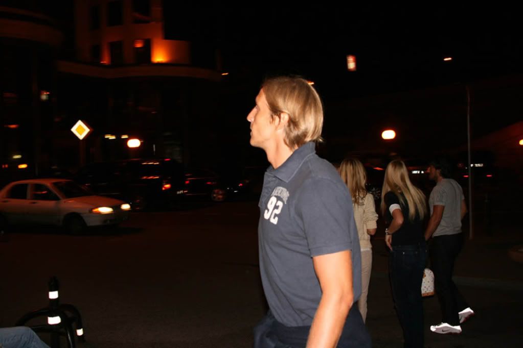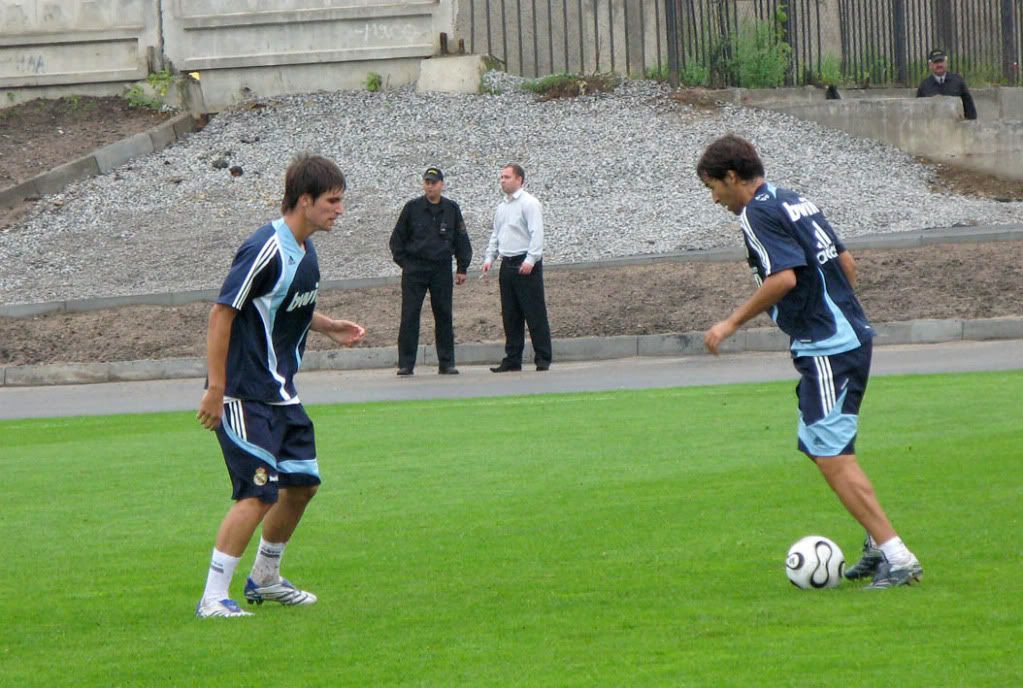 Тренировка проходила на каком-то запасном поле стадиона Локомотив. Его огородили заборчиком, и за ним толклись толпы народу! Черт, хотелось бы, чтоб людей было поменьше. Ну да ладно, мы, в конце концов, очень даже неплохо устроились, прям возле заборчика. Реаловцы выглядели так, словно полночи пили горькую и развлекались. В общем-то, так оно и было : ) Больше всех погулял, судя по виду, Каннаваро. Он полтренировки подпирал ворота и практически спал: ) Но иногда даже бегал, чем вызывал удивление даже у партнеров по команде :) И даже пару раз ударил по мячу. Но все же большую часть тренировки он провел, подпирая ворота Икера, болтая с одноклубниками и заглядываясь на девушек: ) Остальные вроде бы тренировались чуть поактивнее. Смотреть было интересно, во всяком случае.