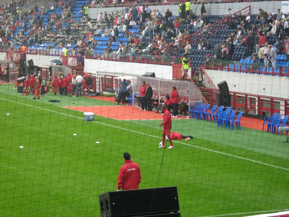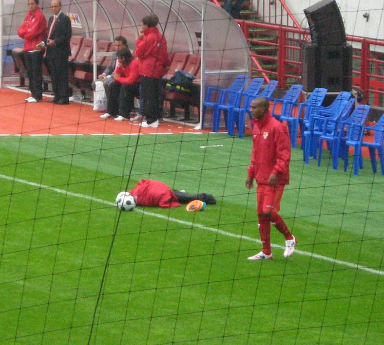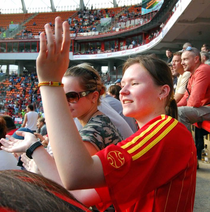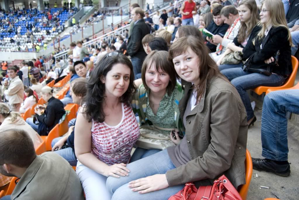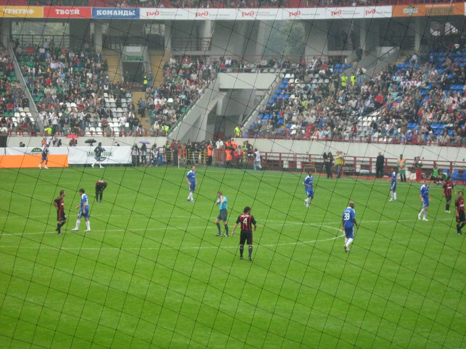 После матча девочки собрались пойти в какое-нибудь кафе, «заливать горе». Я решила присоединиться к ним попозже, так как хотела посмотреть матч Севилья-Локо. Поэтому я перебралась на трибуну к Инне, Кате и Любе. Правда, особой радости мне это не доставило, ибо крыша над их трибуной была, как решето, а дождь, между тем, припустил. Сразу же мое внимание на поле привлек «труп» севильского игрока. :) И только при ближайшем рассмотрении оказалось, что все не так уж страшно :) Игра была довольно живенькая, но дождь и впереди стоящие субъекты не давали толком рассмотреть, что происходит на поле. Словом, после первого тайма, когда Севилья уже вела в счете 2-0, мы с Катей совсем замерзли и решили не дожидаться окончания матча. Она поехала сразу домой, а я в кафе к девочкам. Наконец-то удалось посидеть в теплом помещении и поболтать обо всем. Люблю наши посиделки ТреТредичи, эх почаще бы так. К сожалению, девочкам пора было уходить, так как многие уезжали уже сегодня. Дождавшись Инну, узнав, что Севилья выиграла Кубок РЖД, победив Локо со счетом 3-0, и мы тоже отчалили из кафе. Грустно было прощаться, тем более, что теперь вообще неизвестно, когда мы вот так снова встретимся. Кто знает, а вдруг Милан больше не позовут на Кубок РЖД…