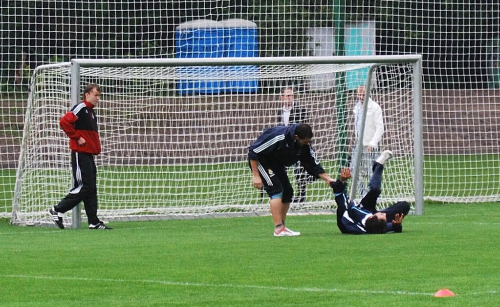 Тренировка длилась около полутора часов и пришла к своему логическому завершению. Игроки стали пробираться к выходу. Напоследок Икер порадовал нас демонстрацией приемов карате и подкатов! Извалял какого-то парня по мокрому