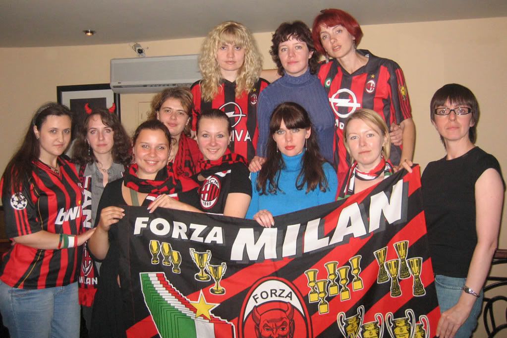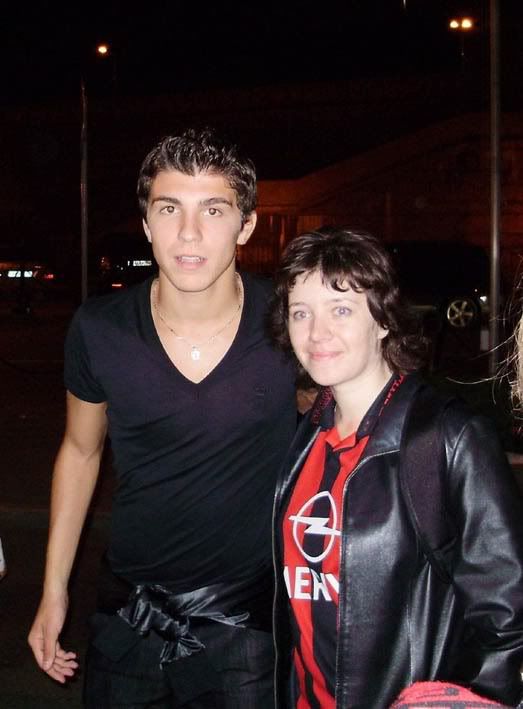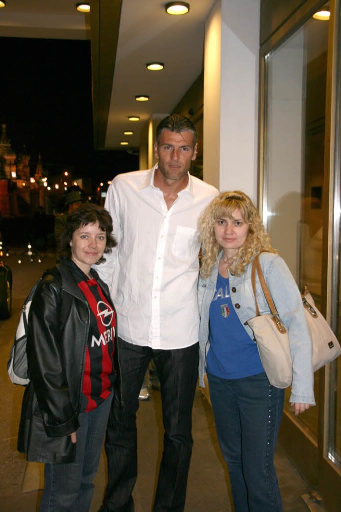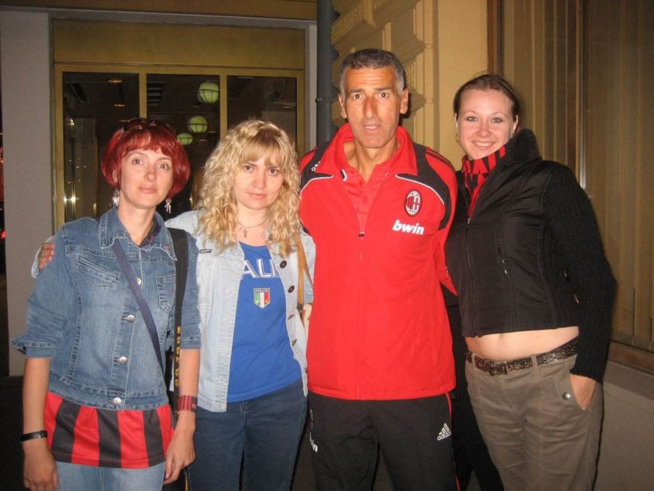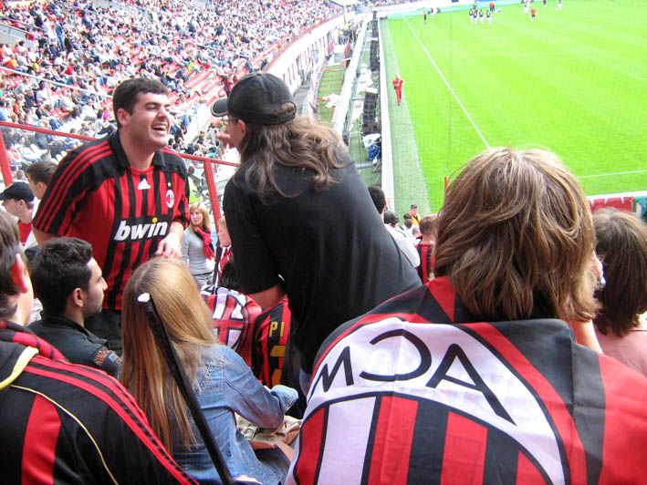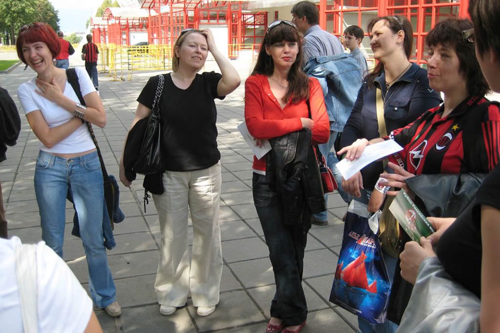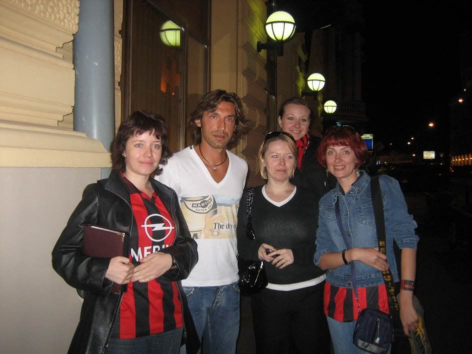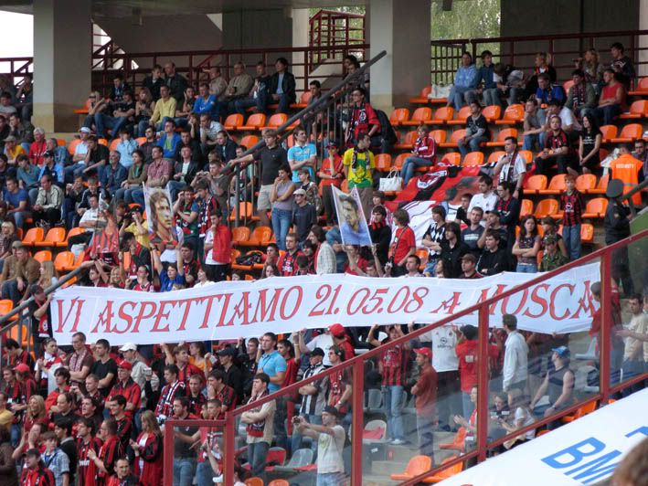 Мы договорились встретиться у станции метро, неподалеку от места, где проходила эта самая пресс-конференция. И пока я там ждала Инну, мимо меня продефилировала троица Миланцев :) Ну, не Неста, конечно, и не Пирло, а молодые какие-то. Они на меня так уставились, улыбаются во все 96 зубов и что-то лопочут по-итальянски! К сожалению, на меня напал столбняк, и я только и могла, что улыбаться им в ответ :) Инна вскоре пришла и мы отправились на стадион. Перед входом встретились с миланскими девочками и наболтались вдоволь. К слову сказать, это была наша первая встреча в реале!!! Поболтав, решили, что пора уже и на стадион идти. К сожалению, мы сидели с ними в разных секторах, но не очень далеко друг от друга.
