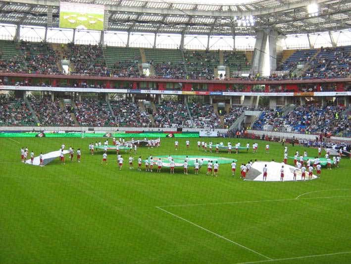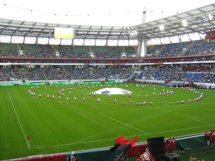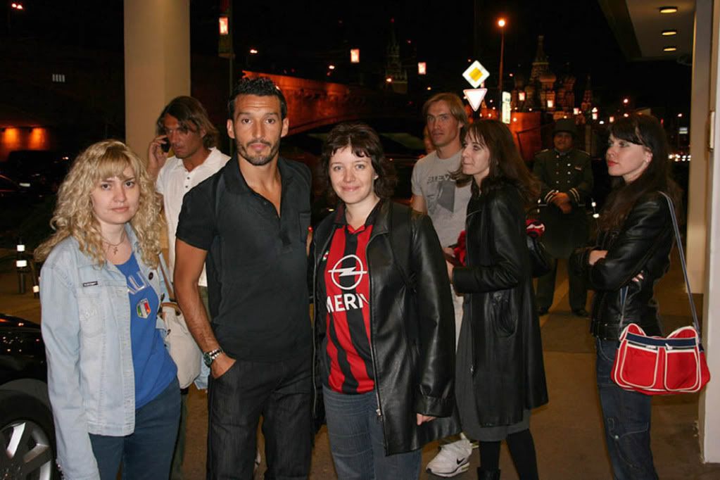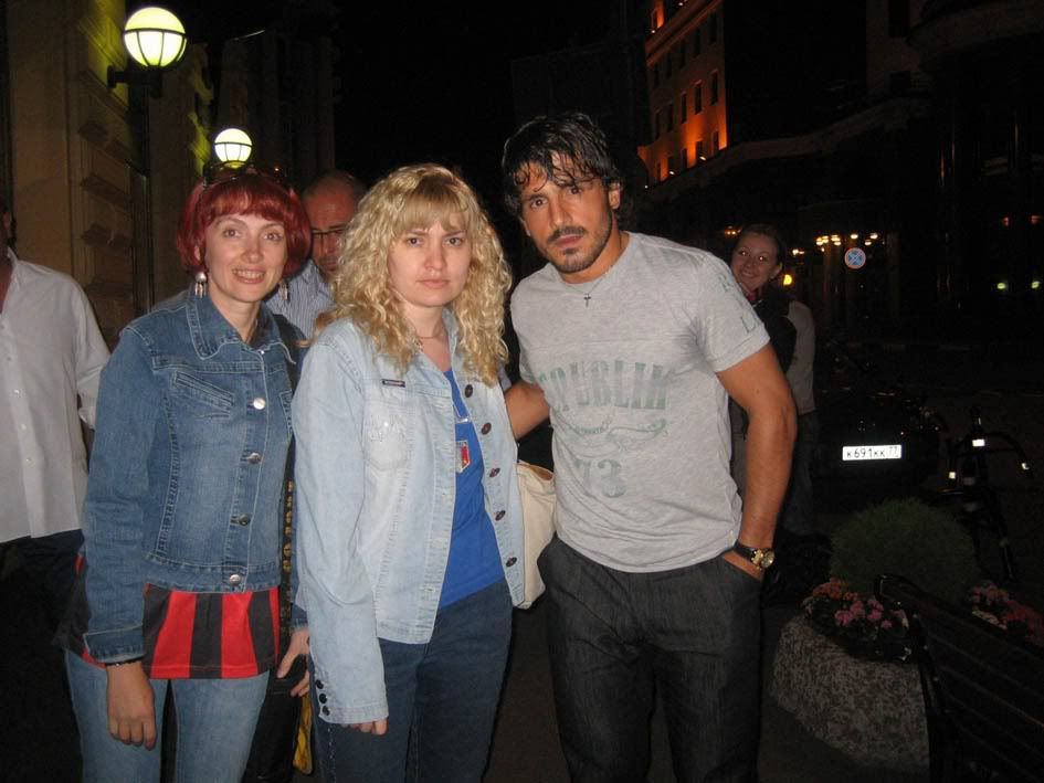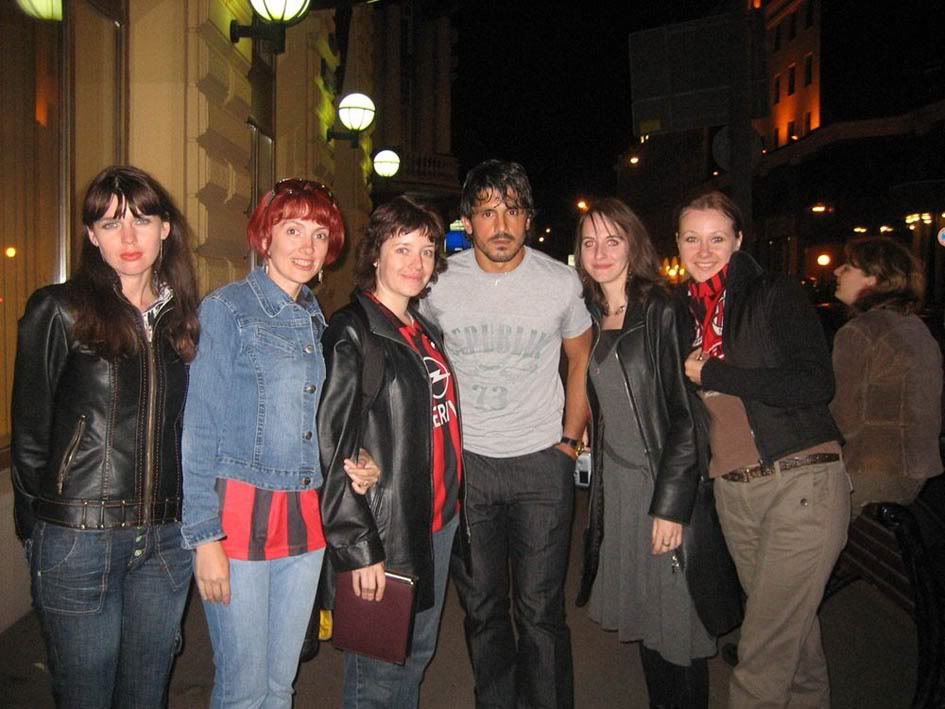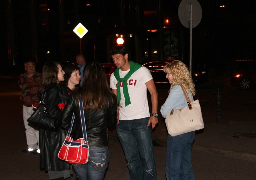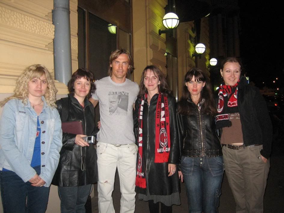 Мы договорились встретиться у станции метро, неподалеку от места, где проходила эта самая пресс-конференция. И пока я там ждала Инну, мимо меня продефилировала троица Миланцев :) Ну, не Неста, конечно, и не Пирло, а молодые какие-то. Они на меня так уставились, улыбаются во все 96 зубов и что-то лопочут по-итальянски! К сожалению, на меня напал столбняк, и я только и могла, что улыбаться им в ответ :) Инна вскоре пришла и мы отправились на стадион. Перед входом встретились с миланскими девочками и наболтались вдоволь. К слову сказать, это была наша первая встреча в реале!!! Поболтав, решили, что пора уже и на стадион идти. К сожалению, мы сидели с ними в разных секторах, но не очень далеко друг от друга.
