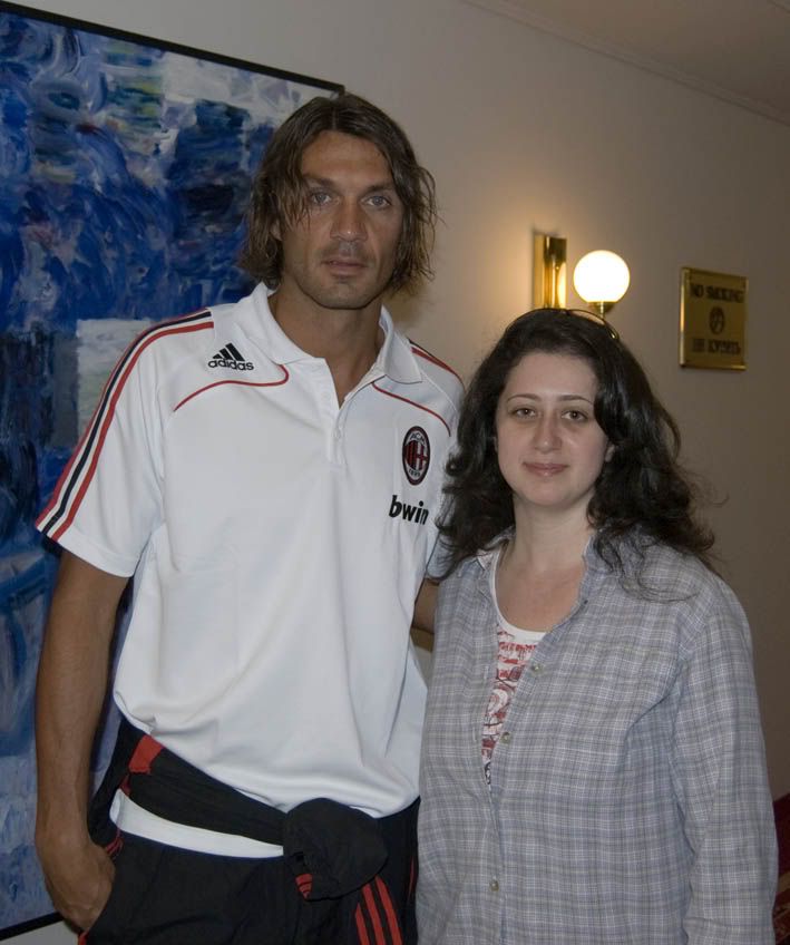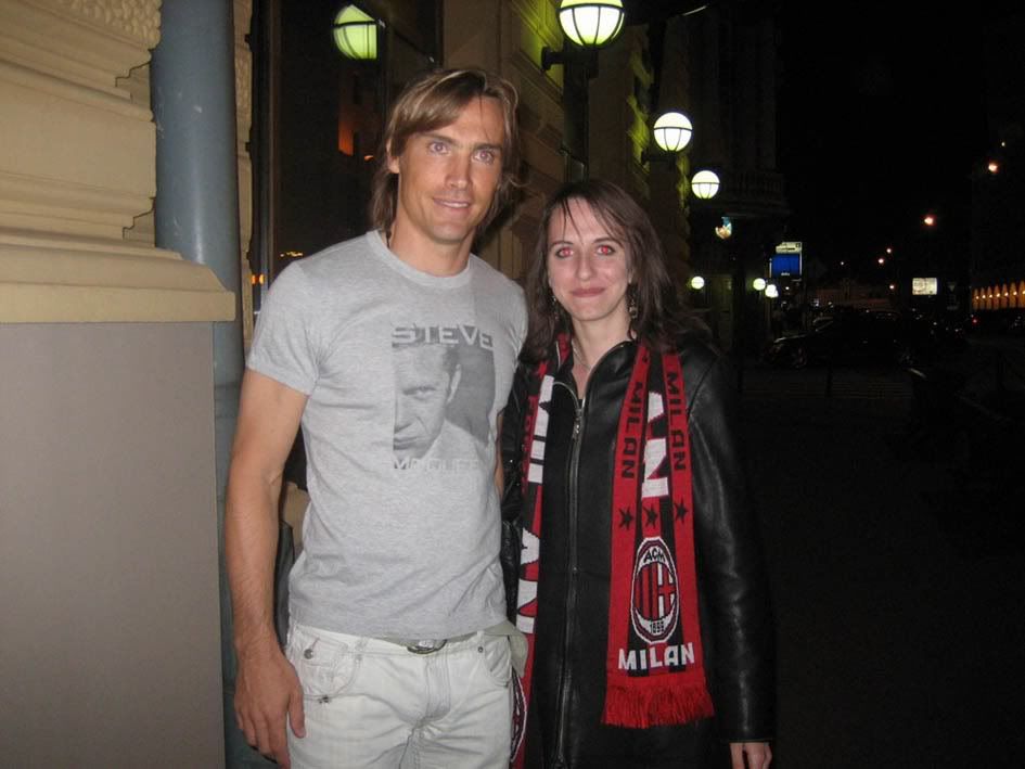В воскресенье, встертившись в кофейне и наболтавшись обо все на свете, снова отправились на сталион. Пока мы проходили четыре кордона и рассаживались по местам, Миланцы уже выползли на поле и вовсю тренировались. К своему сожалению, среди разминающихся мы не обнаружили ни Несты, ни Пирло, ни Оддо. Как обычно, впереди планеты всей разминался Гаттузо, носивший сегодня капитанскую повязку. Откуда столько сил у человека! А потом Рино вдруг увидел, что его снимают, и как-то нехорошо посмотрел на Инну :) Страшно?!: ) Кафу же, напротив, очень мило улыбался прямо в камеру. Исключительно улыбчивый человек! Так и сияет все время, хоть под проливным дождем, хоть под палящим солнцем. Кака отрабатывал финты, аплодировал миланскому сектору, а тут, видимо, спутал мяч с головой:) А помощник тренера, между тем, мучил поочередно Диду и Калача, забивая им пенальти. Пока Миланцы разминались, мы решили, раз уж нет возможности сфотографироваться С ними, сфотографируемся НА их фоне :) Так что, теперь могу хвастаться, что у меня есть фото с Миланом :) Футболисты доразминались и матч начался!