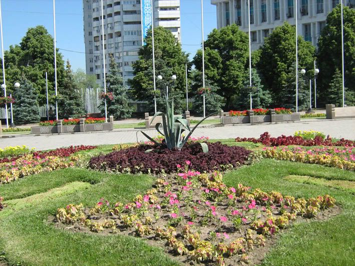 Побродив по площади, обнаружила, что времени еще совсем-совсем мало и на вокзал ехать мне решительно рано. На площади больше нечего было смотреть, и я отправилась на вокзал … пешком. Как оказалось, правильно сделала. Этот район Алматы довольно симпатичный. По пути зашла в какой-то скверик, дабы отдохнуть на скамеечке. А