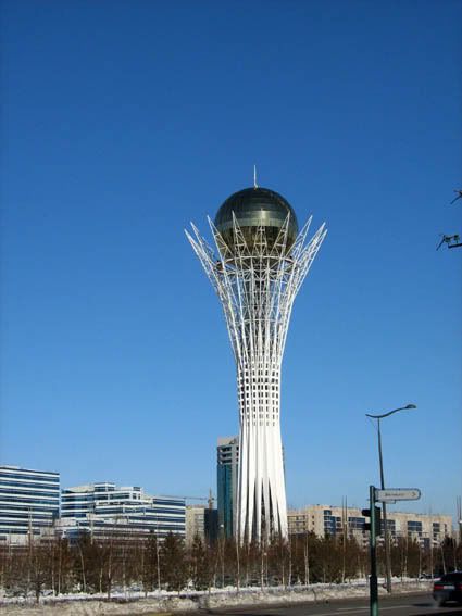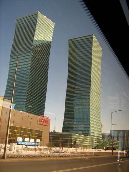 Главной достопримечательностью Астаны является, так называемый Байтерек. Как до него доехать, я не имела ни малейшего понятия, однако, на остановке, где я слонялась в надежде, что на каком-нибудь автобусе увижу это название, у меня же еще и спрашивали, как к нему проехать. Сама бы хотела знать! Узнала в справочном вокзала. Очень удобный маршрут № 21, едет по всем симпатичным местам Астаны. Вот на нем и поехала. По пути из окна фотографировала все подряд.