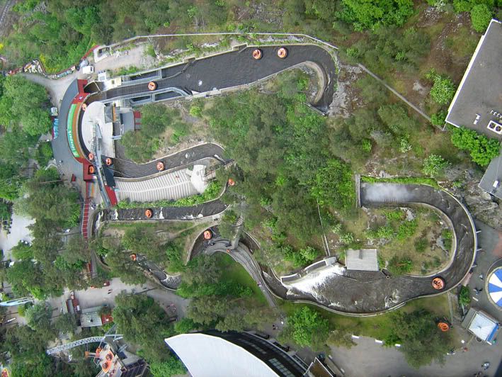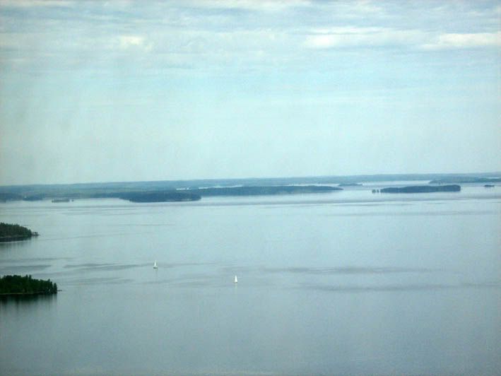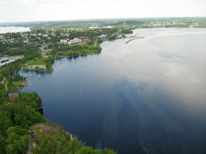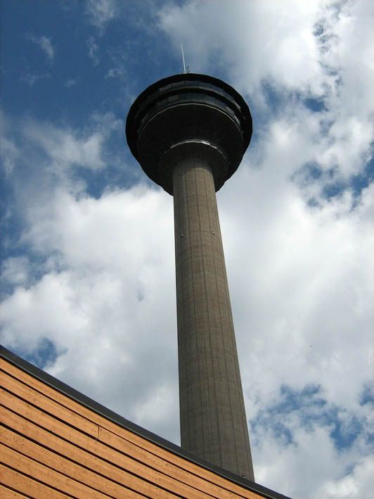 Обломавшись с музеем, направились в местный парк культуры и отдыха, не знаю чьего имени. В парке этом находится высоченная смотровая площадка, как утверждается в путеводителе, самая высокая в Скандинавии. Ради нее, собственно, и пошли. И билет купили только на вход в парк, который автоматически означает посещение башни. Балбесы, надо было покупать единый билет на все аттракционы! Купив билеты, мы еще минут сорок сидели под воротами парка, который открывался только в двенадцать по полудни. (финны-совы!) Когда же парк, наконец, открыли, мы направились первым делом к смотровой башне. На первом ее этаже находится Планетарий и небольшой магазинчик финских сувениров. А еще, совершенно удивительный водный пол, который, к сожалению, вообще не получается на фотографиях. Однако, это такая забава, от которой трудно оторваться. Вместо обычного пола там лежит такое пластиковое стекло или хз, что это, под которым вода. На него наступаешь, вода начинается колыхаться и компьютерные рыбки расплываются в разные стороны. Полнейшее ощущение, что гуляешь по воде! Пока мы там «гуляли», опоздали на очередной сеанс в Планетарии, поэтому, купив билеты на следующий сеанс, поехали наверх, смотреть город. Скоростной лифт домчал нас на верхотуру в считанные секунды! А там нас ожидало зрелище, похлеще водяного пола. Боже, боже, так красиво просто не бывает! Тампере еще называют городом озер. С высоты это отлично видно! Одно озеро там просто необъятное! Даже с такой высоты не видно его берега! Я сначала думала, что это море! Нет, озеро такое! Другие озера поменьше, но не менее красивые. Лично я там готова была весь день провести. Просто сидеть и смотреть. С башни этой преотлично видны и все аттракционы парка, так сказать, вид сверху. Наглазевшись, мы, конечно, тут же придумали на каких хотим