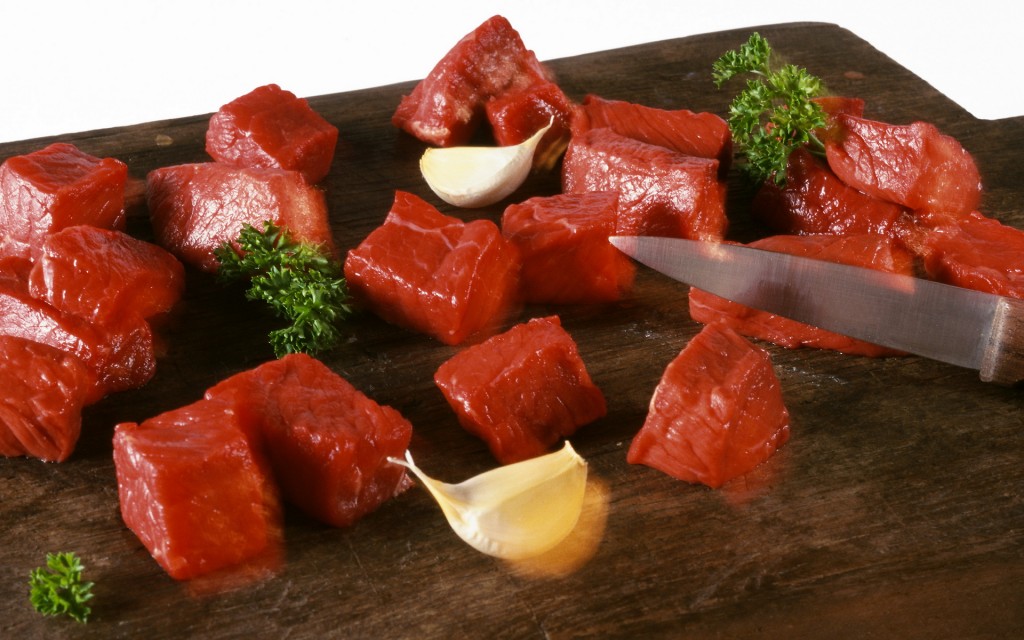 Нарезать мелко лук, чеснок. Говядину нарезать кусочками (примерно – 2-3 см), разогреть