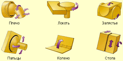Соединение костей в скелете подразделяется на три типа: неподвижное, полуподвижное и подвижное. Неподвижное соединение представлено костями черепа, полуподвижное – соединением позвонков или рёбер с грудиной, осуществляющимися с помощью хрящей и связок. Наконец, подвижно соединяются суставы. Каждый сустав состоит из суставных поверхностей, сумки и жидкости, находящейся в суставной полости. Суставная жидкость уменьшает трение костей при движении. Суставы чаще всего укреплены связками, которые и ограничивают амплитуду движений.