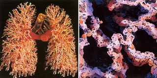Организм получает кислород в процессе дыхания. К органам дыхания относятся носовая полость, гортань, трахея, бронхи, лёгкие. Рассмотрим их по порядку. Носовая полость, образованная костями лицевой части черепа и хрящами, выстлана слизистой оболочкой, которую образуют многочисленные волоски и клетки, покрывающие полость носа. Волоски задерживают частички пыли из воздуха, а слизь предотвращает проникновение микробов. Благодаря кровеносным сосудам, пронизывающим слизистую оболочку, воздух, проходя через носовую полость, очищается, увлажняется и согревается. Через носоглотку воздух поступает в гортань, образованную хрящами, которые соединены между собой связками и мышцами. Здесь расположены голосовые связки, вибрация которых при прохождении воздуха вызывает образование звуков. Далее воздух поступает в трахею, имеющую форму трубки длиной 10–14 см. Хрящевые кольца, составляющие её стенки, не позволяют задерживаться воздуху при любых движениях шеи. Внизу трахея разделяется на два бронха, которые входят в правое и левое лёгкие. Здесь они ветвятся на бронхиолы и заканчиваются лёгочными пузырьками (альвеолами). Бронхиолы и альвеолы образуют два лёгких. В лёгких насчитывается более 300 миллионов альвеол.