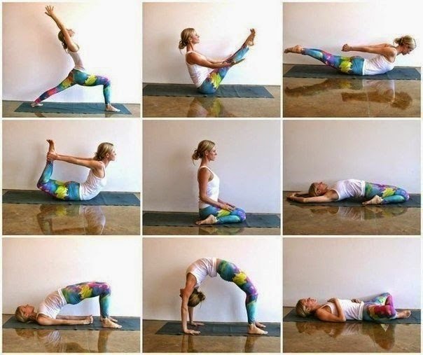 3. Салабхасана. Лягте лицом вниз к мату. Сомкните пальцы рук в замок за спиной и прогнитесь назад, чтобы грудь была раскрыта. Выдохните и на вдохе поднимите ноги и грудь. Держите шею, глаза и лицо в расслабленном состоянии и удерживайте в течение 5 вдохов. Для это позы особенно важен хороший коврик,так как кости таза плотно прижаты к полу,что может вызывать боль