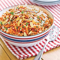 3. Мелко нашинковать лук. В миске смешать морковь, лук и петрушку. Полить салат из моркови заправкой и тщательно размешать. Перед подачей посыпать салат из моркови поджаренными ломтиками миндаля.