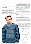 ОПИСАНИЕ РАБОТЫ.Свитер выполнен поперечным вязанием. На спицы №3 наберите 262 п., свяжите10 рядов платочной вязкой, 2 ряда ажурным узором, 10 рядов платочной вязкой, 4 ряда ажурным узором, 10 рядов платочной вязкой, 2 ряда ажурным узором, 10 рядов платочной вязкой, 6 рядов ажурным узором, 10 рядов платочной вязкой, 2 ряда ажурным узором, 10 рядов платочной вязкой, 4 ряда ажурным узором, 10 рядов платочной вязкой, *2 ряда ажурным узором*. От рядов, обозначенных *, чередуйте ряды ажурного узора и платочной вязки в обратном порядке. Одновременно, провязав 54 ряда от начала работы, для выреза горловины разделите деталь пополам и обе половинки вяжите раздельно, провязывая деталь СПИНКИ прямо, а на детали ПЕРЕДА для углубления выреза закрывайте в каждом 2-м ряду 1 раз 4 п. и 8 раз по 1 п. Провяжите прямо 36 рядов, затем прибавьте в каждом 2-м ряду 8 раз по 1 п. и 1 раз 4 п. Далее соедините петли спинки и переда, провяжите 54 ряда и закройте петли. По низу переда на спицы №2 наберите 66 п., свяжите 18 рядов лицевой гладью, 2 ряда ажурным узором (= линия перегиба), 18 рядов лицевой глади и закройте все петли. Так же обработайте низ спинки.