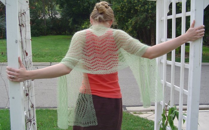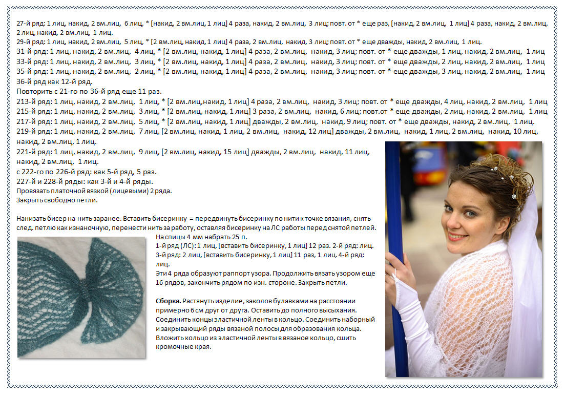 Вам потребуется: 2 мотка пряжи Rowan Kidsilk Haze (по 25 г), спицы 4 мм и 7 мм; примерно 120 шт бисера; 6 см эластичной ленты шириной 6 мм