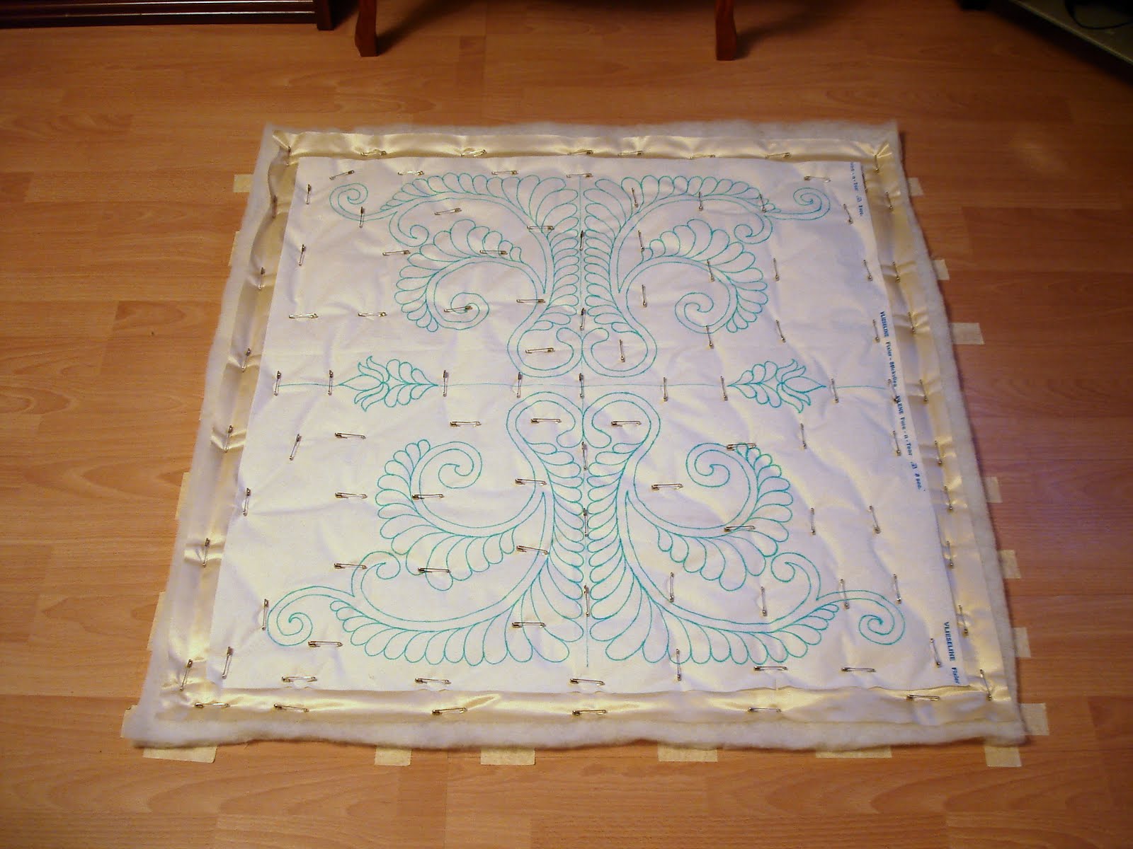 Конверт выполняем в технике имитация трапунто. В этой работе я использовала специальную ткань для пэчворка (хлопок50% / 50%шелк). Итоговый размер работы 90*90 см. Сначала придумываем узор на миллиметровой бумаге размером 80*80 см. Затем переводим его на стабилизатор с помощью водорастворимого маркера для квилтинга или пользуемся обычным карандашом. Режем из ткани 2 квадрата 95*95 см (в итоге при усадке получится как раз 90*90 см). Для окантовки нарезаем 4 полосы 8*100 см. Про окантовку здесь больше не буду говорить, как правильно окантовать изделие и как сделать сэндвич можно посмотреть в моем МК "Сказочные звезды".