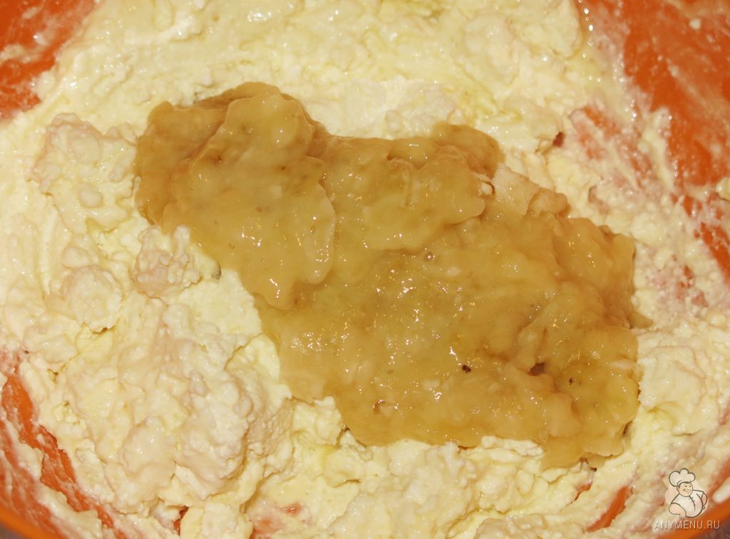 Шаг 3: В отдельной миске, бананы размять вилкой в пюре. Добавить банановое пюре к творогу, перемешать в однородную массу.