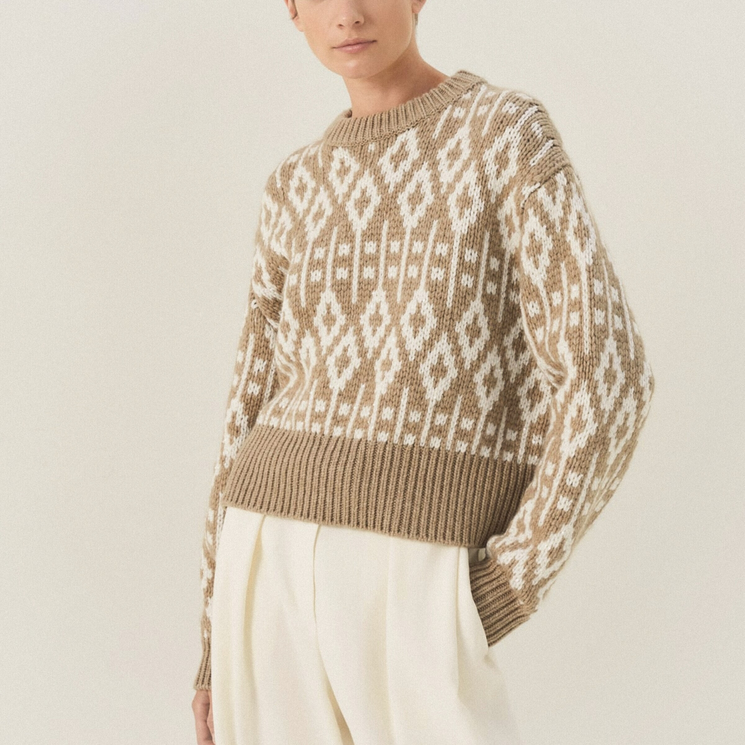 В оригинальном свитере используется 100% кашемир. Чем хорош такой состав, так это способностью увеличиваться в объёме после стирки, а это важно для узора.
