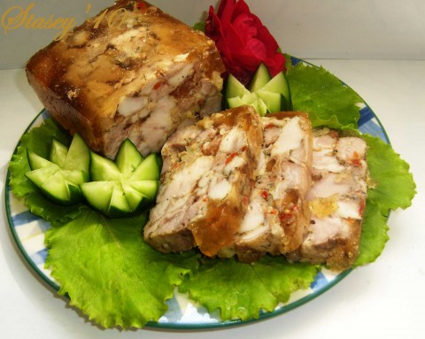 Итак, берем куриную грудку (2 шт.) режем меленько, добавляем приправу для курицы, соль, перец черный молотый, красный сладкий молотый, чеснок (мелко резать), укроп, сладкий перец сушеный в лепестках, 1,5 стол. ложки желатина (в порошке), чуть водички. Перемешиваем. Всё кладем в форму (прямоугольную, для запекания), формочку - в рукав для запекания, рукав завязываем, делаем проколы - и в духовку, на 40-45 минут. Остудить (потом - в холодильник). Всё!