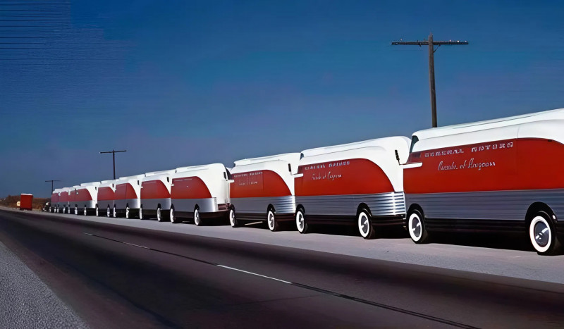 А громадные красно-белые машины – это так называемые Futurliner – участники одного из самых грандиозных автошоу, когда-либо проходивших на планете Земля.