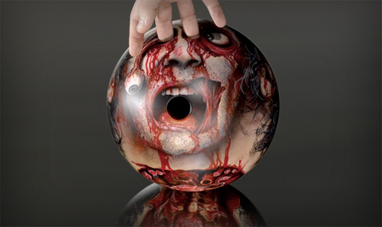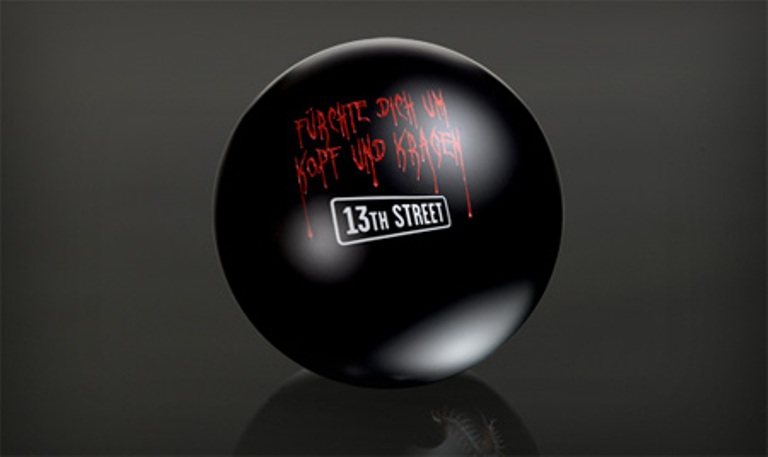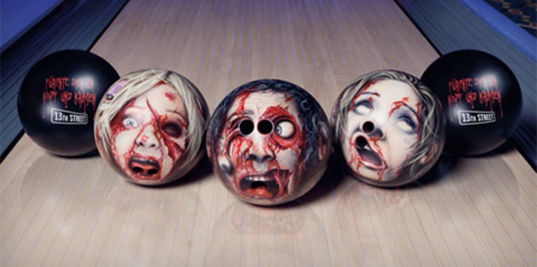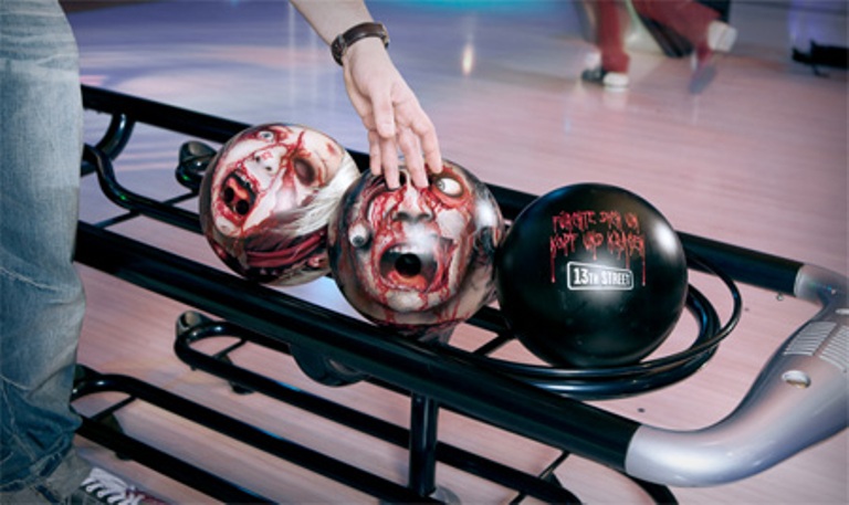 Креативная реклама на шарах для боулинга, исполненная в стиле лучших фильмов ужасов. Такой необычный промоушн провел телевизионный канал 13th STREET.