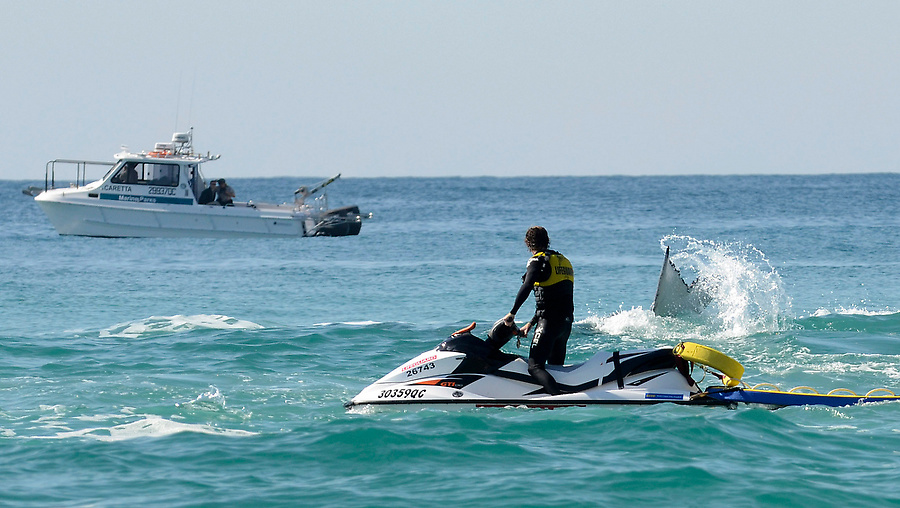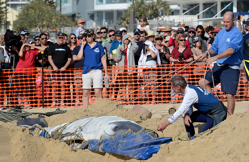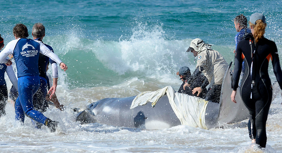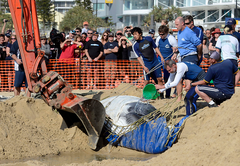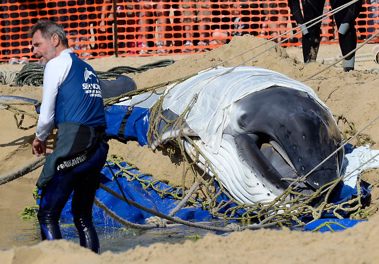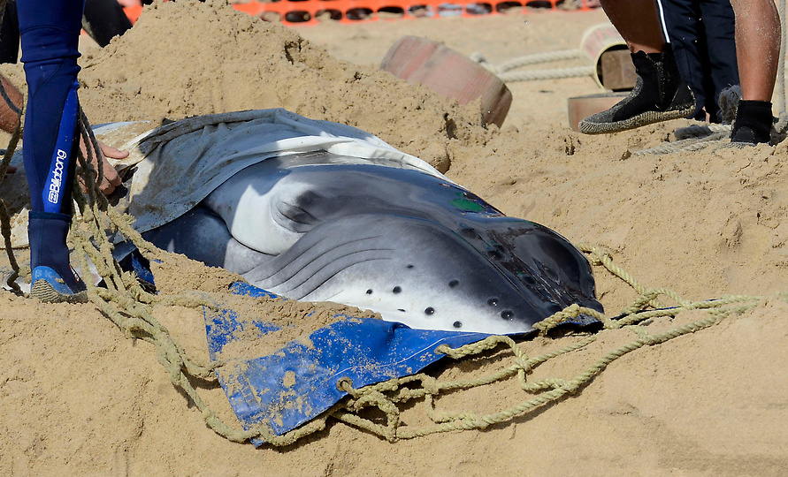 Сотни прохожих наблюдали за тем, как два водных мотоцикла отбуксировали китенка в полосу прибоя, откуда ему предстояло вернуться обратно в океан.