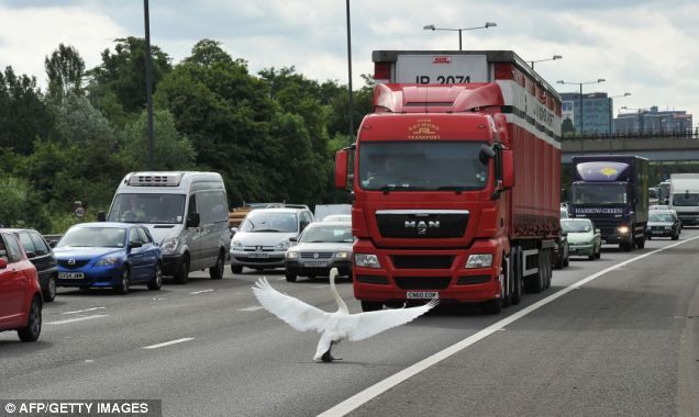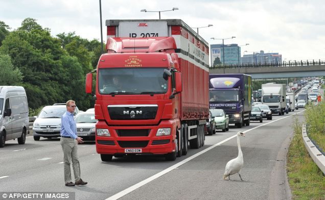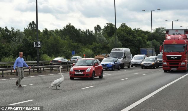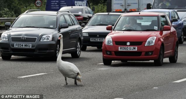 Лебедь заблокировал целый транспортный поток, образовав дорожную пробку.