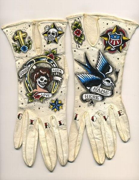 Дизайнер Ellen Greene предложила отличный вариант для сомневающихся делать тату или нет - перенести ее на одежду. Например, на винтажные женские кожаные перчатки, нарисовав на них истинно мужские тату. Перчатки из этой серии не носибельны, они - предмет искусства, однако идею можно продолжить и развить во что-нибудь оригинальное.