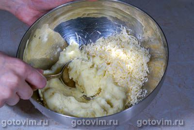 Картошку почистить, залить холодной водой и поставить на огонь. Когда вода закипит - посолить. Варить до готовности, затем слить воду, картошку размять, добавить тертый сыр и перемешать. |
