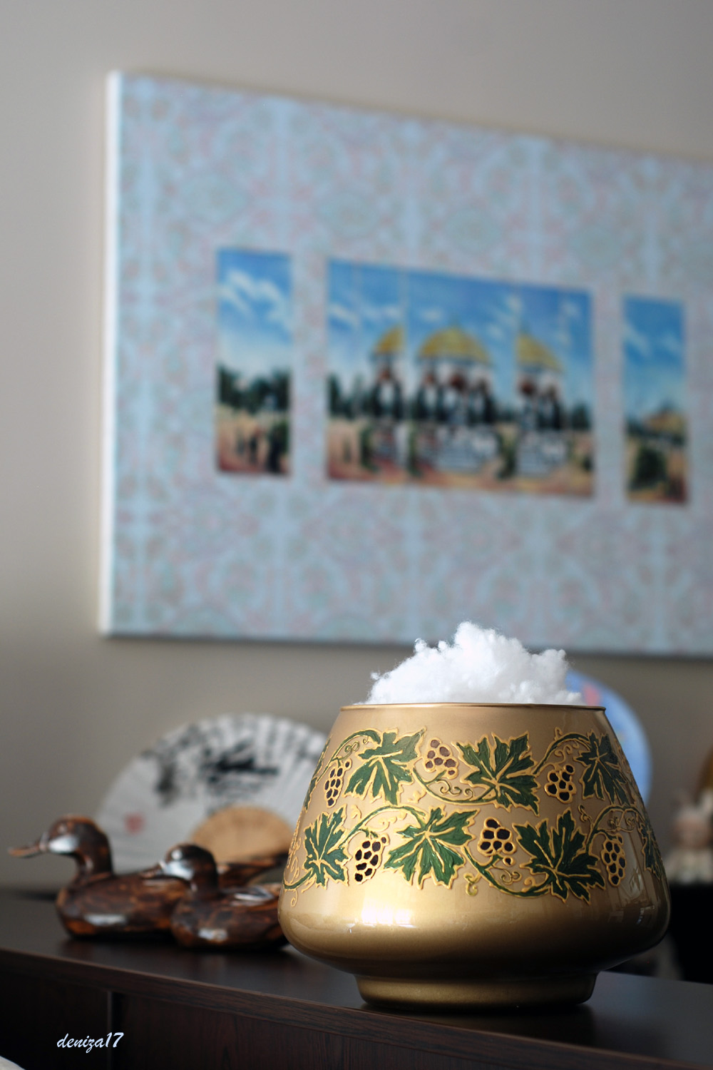 Когда я рукодельничаю, то люблю, чтобы все было под рукой. Но при таком разнообразии увлечений как у меня спасти дом от бардака совсем не просто. Шитьем, декупажем, рисованием я занимаюсь в кабинете, куда стараюсь гостей не запускать, чтобы не пугались ;) А вот вяжу я исключительно в зале перед телевизором. И возникает вопрос, куда же прятать этот ооогромный мешок с наполнителем, который я использую для вязаных игрушек. И тут я решила создать для зала новый элемент декора. Купила прозрачную стеклянную вазу, нанесла на нее орнамент и покрасила в бронзовый цвет, под стать штучкам на консоли. Вот она моя последняя стеклянно-витражная работа. Теперь и наполнитель всегда под рукой, и видимости беспорядка нет.
