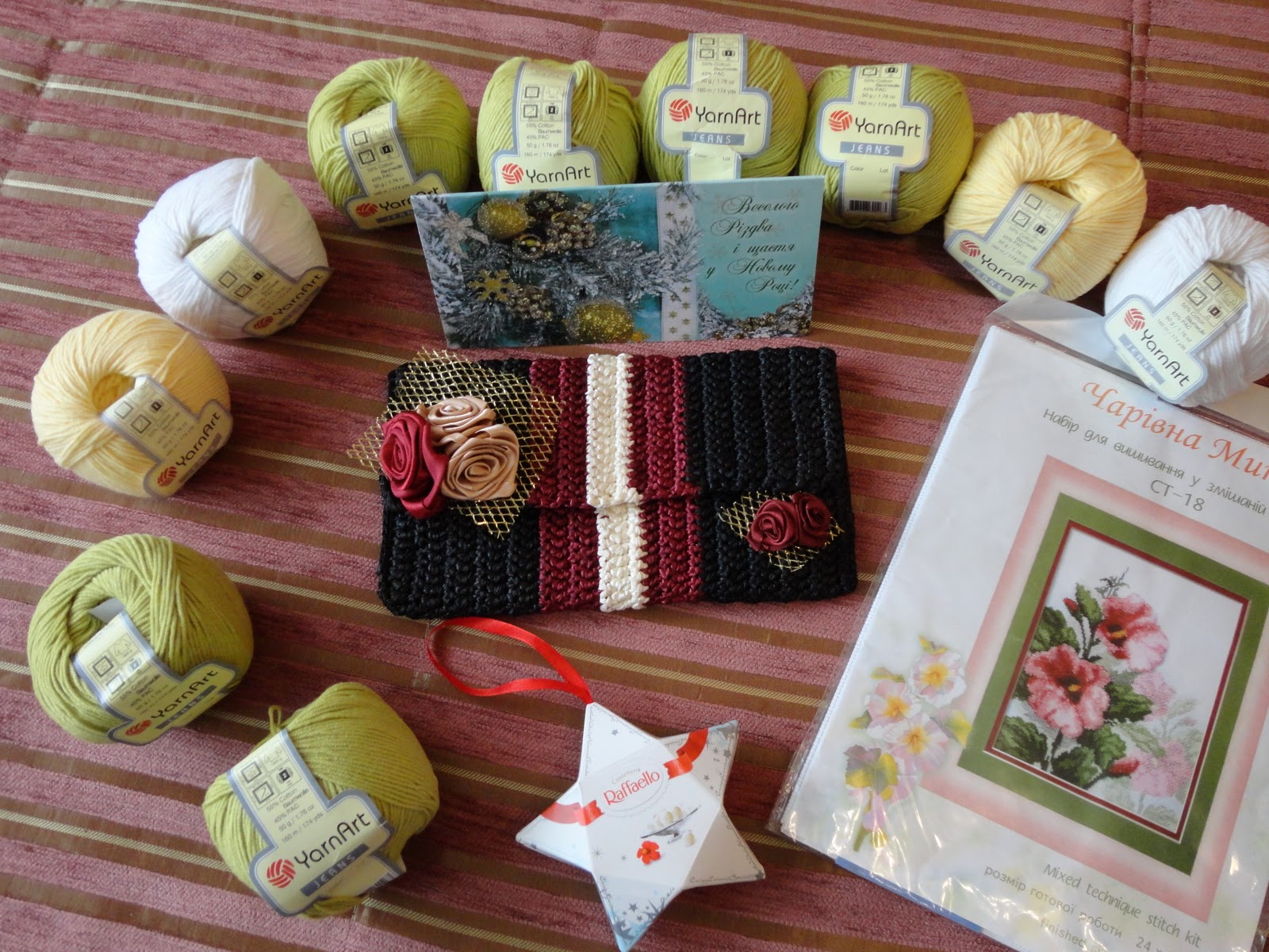 [показать]Я выиграла конфетку от Inna-dukinna http://dukinna-71.blogspot.com/ и хочу вам показать всю эту вкусняшку. Конфетка меня очень порадовала, там столько всего нужного: и ниточки, аж 10 моточков, и очень красивый набор для вышивки крестом, открыточка и мои любимая конфетка Рафаэлло. Ну, и самое главное вязаная косметичка, украшенная розочками из лент. У меня было столько положительных эмоций! Спасибо Инна!!!