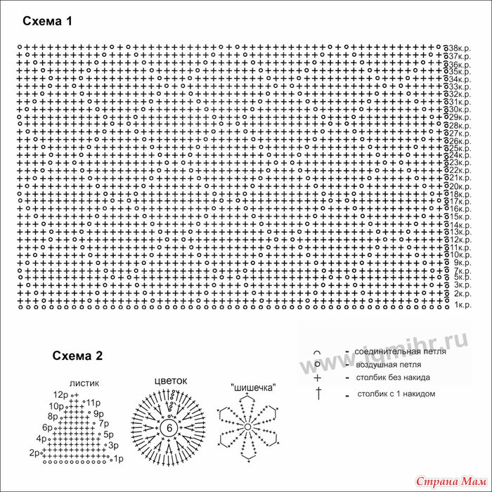 Чтобы избежать ошибок в работе и связать изделие желаемого размера связать образец узором по схеме 1. По образцу и выкройке сделайте расчет петель.