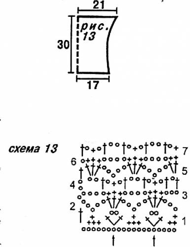 Рукав:связать цепочку из 53 ВП, вязать узором по сх.3, прибавляя для расширения рукава по 1п. с обеих сторон в каждом 2-м р. На высоте 50 см от начала работы для оформления оката закрыть 6С/Н, убавить 1 раз 4 С/Н, 1 х 2 С/Н, 3 х 1 С/Н в каждом 2-м р. На высоте 65 см работу закончить.