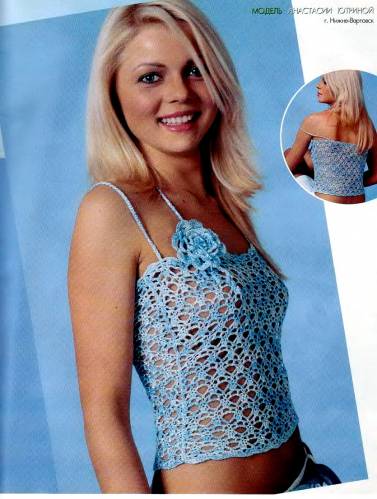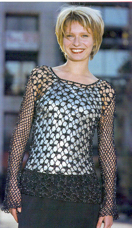 Стильная кофточка, связанная крючком, привлекает внимание.