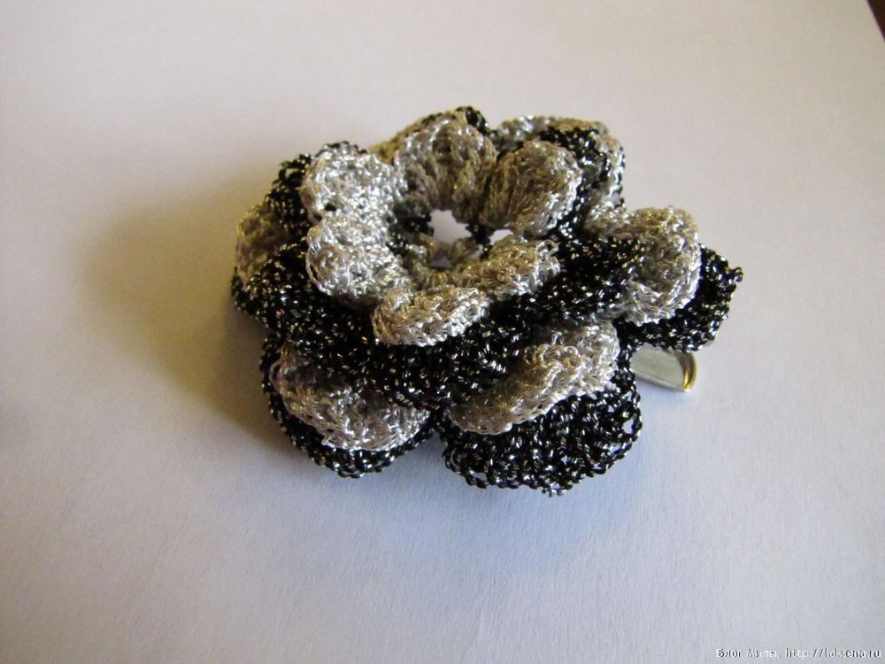 Пряжа «Ирис» от Гамма, металлизированная, 100% полиэстер (20гр, 87 м) по несколько грамм черно-серебристого и серебристого цвета, крючок 2,0, заготовка для заколки — крокодила (или заготовка для броши), клеевой пистолет..